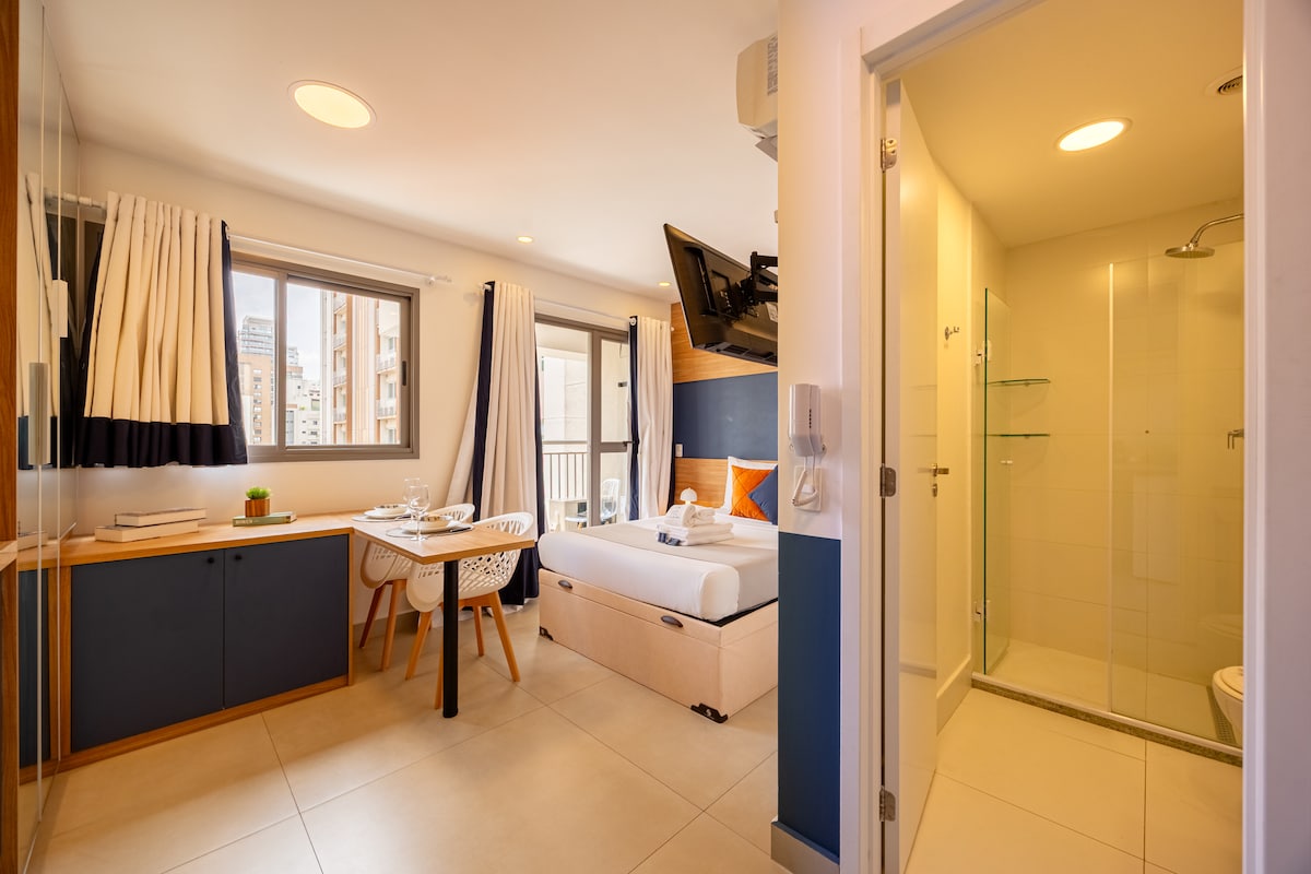 Квартира Nobile полностью расположена в центре Jardins - в Al. Кампинас, на углу Al. Сантос, всего в 1 квартале от Паулиста-авеню. Квартира площадью 30 кв. м. Хорошо оформленная, с гостиной и спальней, 1 двуспальной кроватью размера Queen size (может быть преобразована в 2 односпальные кровати) и вмещает до 4 человек. К услугам гостей диван-кровать / Wi-Fi / телевизор, кондиционер, оборудованная кухня, письменный стол, рестораны на первом этаже и круглосуточное обслуживание номеров. К услугам гостей бассейн, тренажерный зал, прачечная, парковка и ежедневная уборка.