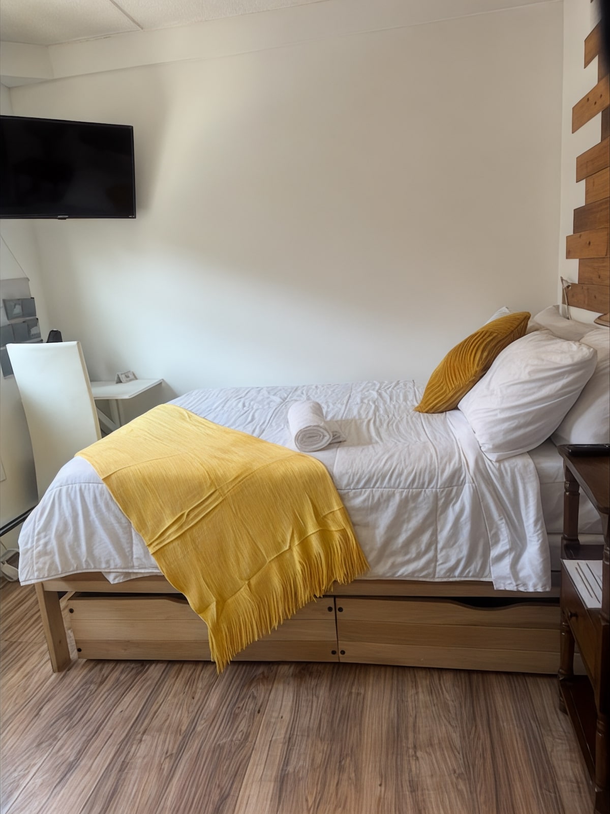 Это отдельная комната с полноразмерной кроватью, приставным столиком, туалетным столиком и шкафом. В шкафу есть дополнительные одеяла, простыни, вентилятор и обогреватель. Кроме того, мы также предоставили гостю собственный небольшой холодильник, удобное кресло и стол с завтраком.