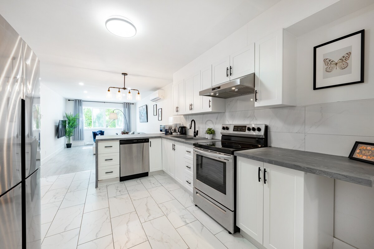 Отдохните в Монреале в стильный люкс! Ничто на фотографиях здесь не используется совместно с другими 🔐 + ваш отдельный вход🚪 Расслабьтесь в просторной гостиной на умном большом экране. 📺 Сон на удобной кровати размера Queen size. 🛏️ Все в подвале на тихой улице. 💤 Автомобилем 🚙 15 минут до центра Монреаля 6 минут до станции REM Panama и торгового центра Champlain. 5 минут до торгового центра DIX30. Пешком🚶🏻🚶🏻♀️ 12 минут до продуктового магазина. Бесплатная уличная парковка 🅿️ Стиральная/сушильная машина включена в стоимость. 🧺 Разнообразные 🍽️ рестораны в нескольких минутах ходьбы. Забронируйте жилье сегодня : )