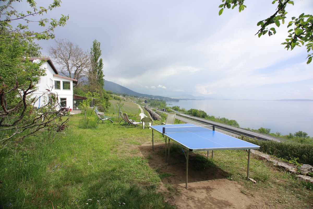 ★ DESCRIPTION ★ One-room apartment with a large mezzanine dormitory (max. 16 sleepers) in isolated house. Stunning view of Lake Neuchâtel. Garden with barbecue area. Close to the lake. 💦 Pool from May to September, depending on weather. Indoor fireplace with small grill, ping-pong, indoor games... Parties are allowed 🎈 You can make noise, but please refrain from excessive noise outside at night, as there are still neighbours 200 m. away.