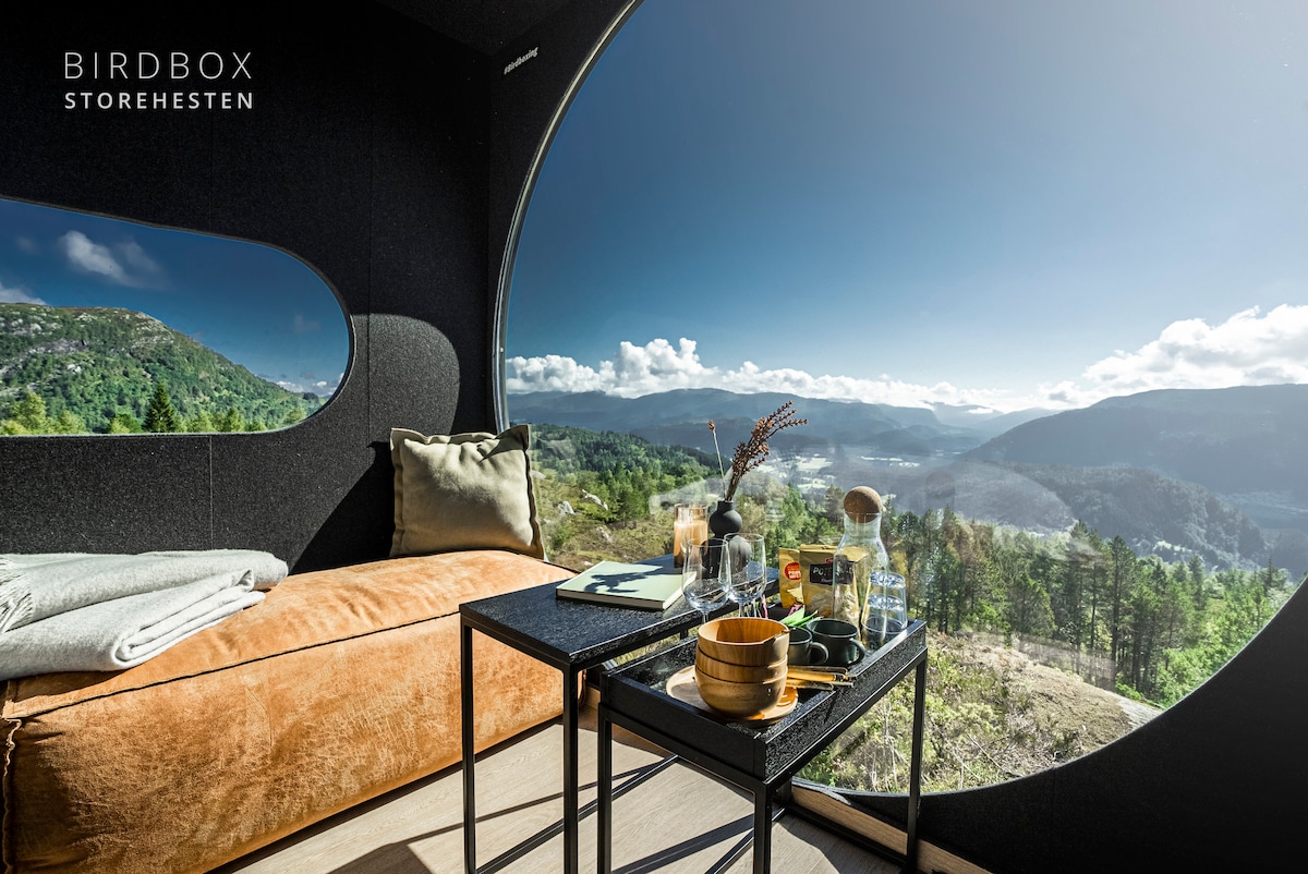 Relax, rejuvenate and unplug in this unique contemporary Birdbox. Feel close to nature in ultimate comfort. Enjoy the view of the epic mountain range of Blegja and the Førdefjord. Feel the true Norwegian countryside calmness of birds chirping, rivers flowing and trees in the wind. Explore the countryside area, walk down to the fjord and take a swim, hike the surrounding mountains, relax with a good book & meditate. Enjoy the unique Birdbox experience. #Birdboxing