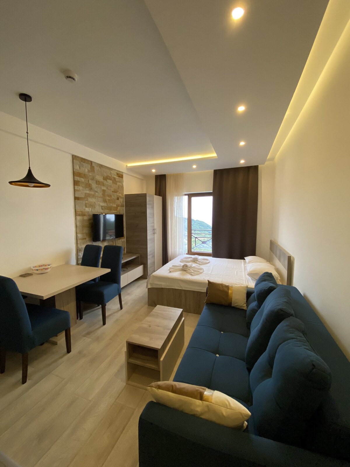 Наша квартира имеет 40 кв.м., две отдельные комнаты, кухню и ванную комнату. Это часть 4-звездочного спа-отеля Zoned. Он оснащен новой, современной мебелью. К услугам гостей бесплатная парковка, бесплатный Wi-Fi, телевизор. В том же здании есть крытый бассейн,спа,тренажерный зал(за дополнительную плату), кафе и два ресторана, которые могут использовать наши гости. Она идеально расположена, в довольно уединенном месте, с прекрасным видом, в центре деревни Копаоник, в 7 минутах езды от лыжных подъемников (каждые 30 минут организуется мини-автобус от отеля).