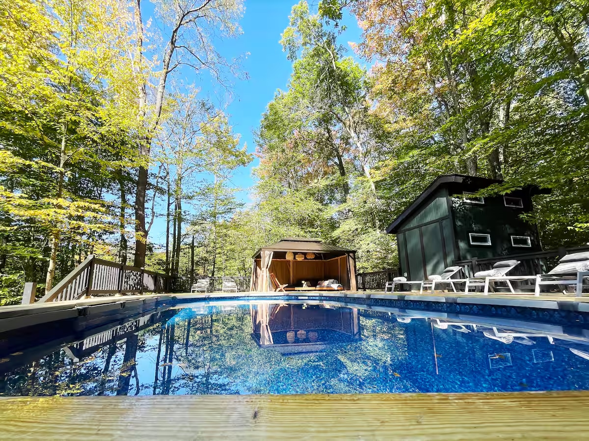 ☞ Коммунальные сборы включены ☞Собственная гидромассажная ванна на 10 человек ☞Частный каяк ☞ Камин ☞Высокоскоростной WI-FI ☞Полноразмерный бильярдный стол, стол для пинг-понга, игровой автомат. ☞ Теннисные корты ☞7 минут до природной зоны Остина Т. — пешеходные тропы, водопады ☞20–35 минут до Калахари, зиплайнов Camelback, винного троллейбуса Pocono Daytripper, фестивалей осенней листвы и тыкв, верховых прогулок и т. д. ☞ Полностью укомплектованная кухня ☞Костровая чаша (дрова включены) Можно с☞ животными ☞ Самостоятельное заселение. ☞ Кровать размера King size ☞ Стильная и сушильная машины.