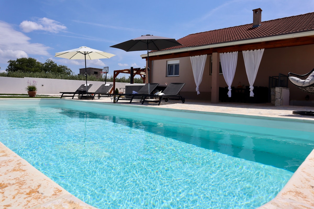 Holiday house Jona is located in a small village in the heart of "Ravni Kotari". The house is located on a 7000 square meter ranch that has a large guest-only swimming pool and is surrounded by vineyards and various fruit trees that guests have at their disposal. The house is ideal for a complete dream vacation where you can afford complete peace of mind. House Jona is new and fully equipped with dishwasher,washing machine,coffee aparat,grill,air conditioning,wi-fi internet, ultra-slim TV, etc.