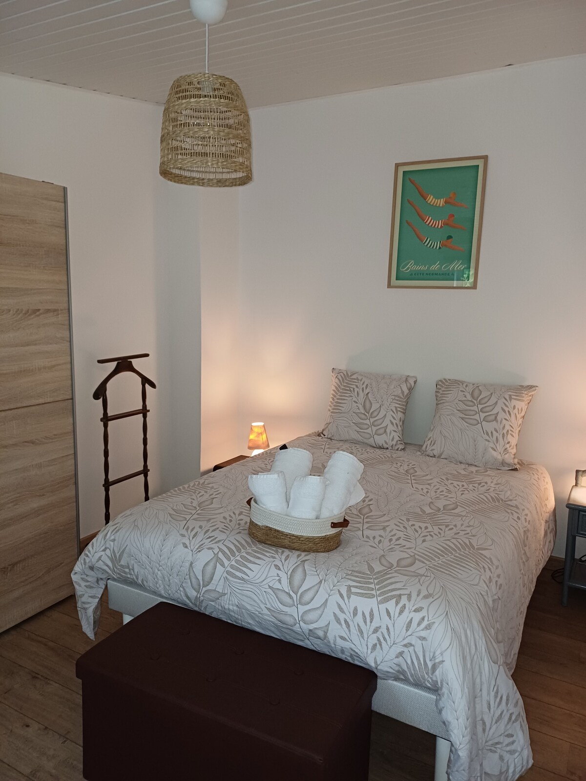 Забудьте о заботах в этом просторном и умиротворенном жилье. У вас есть доступ к входу, столовой с оборудованной кухней, где вы можете приготовить себе еду, санузлу на первом этаже, наверху у вас есть отдельная комната с телевизором и шкафом, ванные полотенца могут быть предоставлены по запросу без дополнительной платы, постельное белье предоставляется, у вас есть доступ на улицу, чтобы выпить кофе, парковочное место перед пляжным домом, рядом в 20 минутах езды на автомобиле и в 10 минутах езды от центра города Кана.
