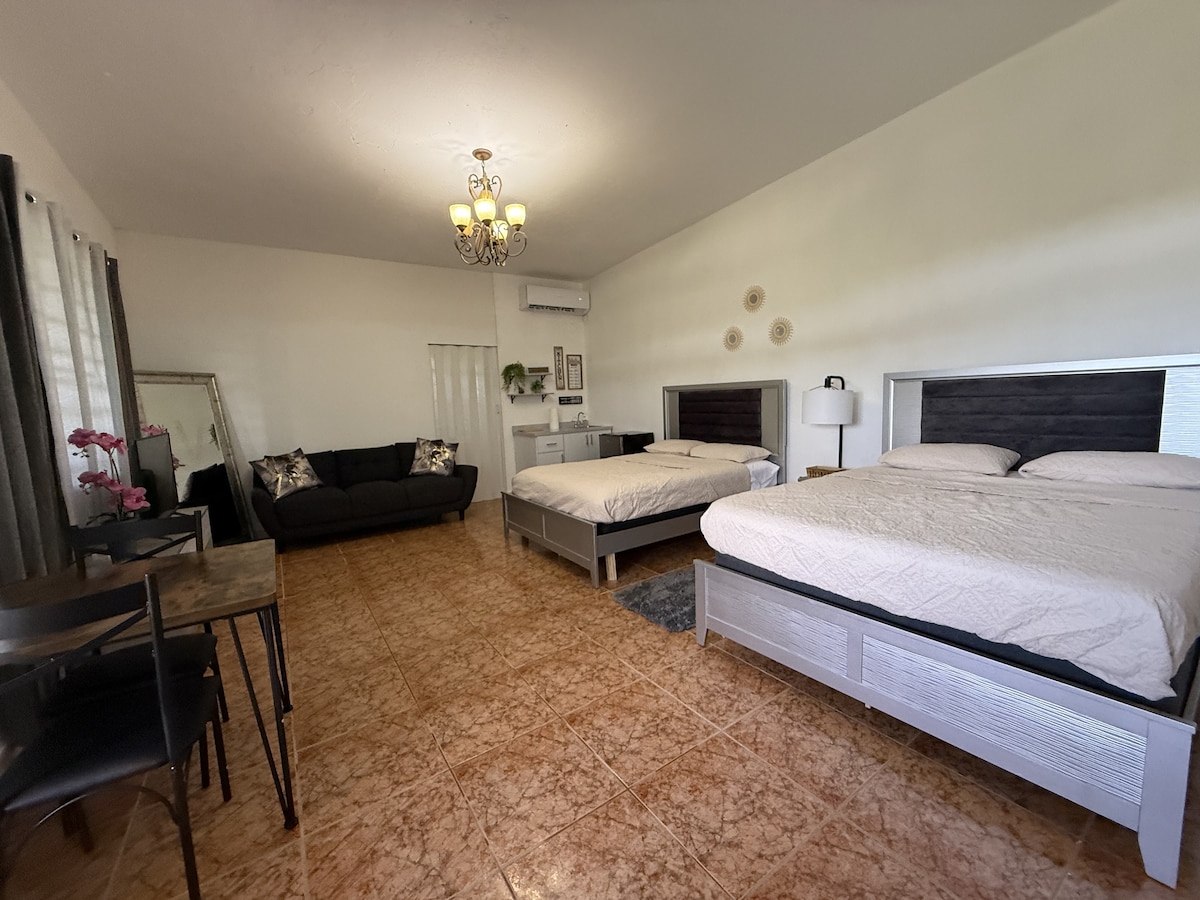 Отдельная квартира в здании с контролируемой парковкой. Квартира с 1 спальней и 1 ванной комнатой меблирована и оформлена, чтобы вы чувствовали себя как дома. Есть Wi-Fi и телевизор с Roku, так что вы можете смотреть потоковые фильмы или получать доступ к электронной почте во время отпуска. Удобное патио с видом на фасад. На территории есть общая прачечная с коммерческой стиральной машиной и сушилкой, которыми можно пользоваться за небольшую плату. Расположена в центре Агуадильи, примерно в 10 минутах езды от торговых центров, парков и пляжей.
