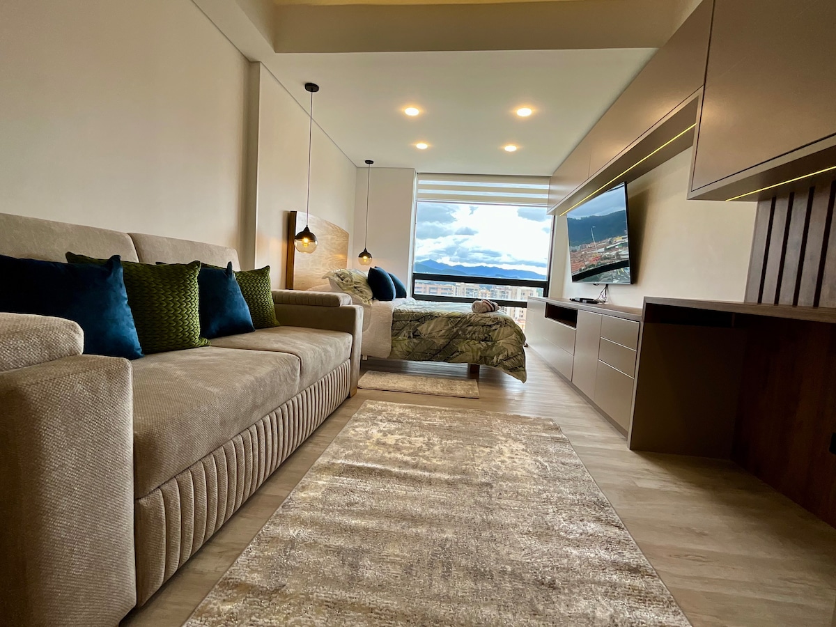 Насладитесь стильными впечатлениями в этой новой квартире-студии площадью 323 фута. Полностью меблирована и оборудована стиральной машиной-сушилкой, кухней, холодильником, смарт-телевизором, Wi-Fi, двуспальной кроватью размера Queen size, столовой и современными рабочими и зонами отдыха в здании. Красивый вид на горы восточной саванны Боготы.