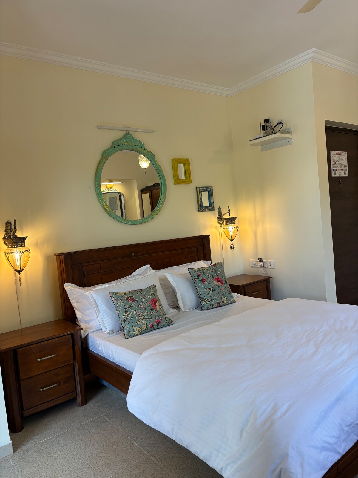Яркая ночная жизнь Гоа в Баге (Калангут) Всего 7 минут езды до пляжа Бага и клуба Тито. Наслаждайтесь: - 2 бассейна и джакузи. - Современный тренажерный зал с паром и сауной для велнеса. - Веселая игровая комната с бассейном, карром и не только. - Спокойный ландшафтный сад для отдыха. Особенности люкса: - хорошо освещенный номер Deluxe; - Плюшевая двуспальная кровать размера King size с роскошным постельным бельем. - Крытая парковка. - LED-телевизор с популярными OTT-платформами для развлечений. - Молниеносный Wi-Fi для бесперебойного подключения. - Резервное питание инвертора.