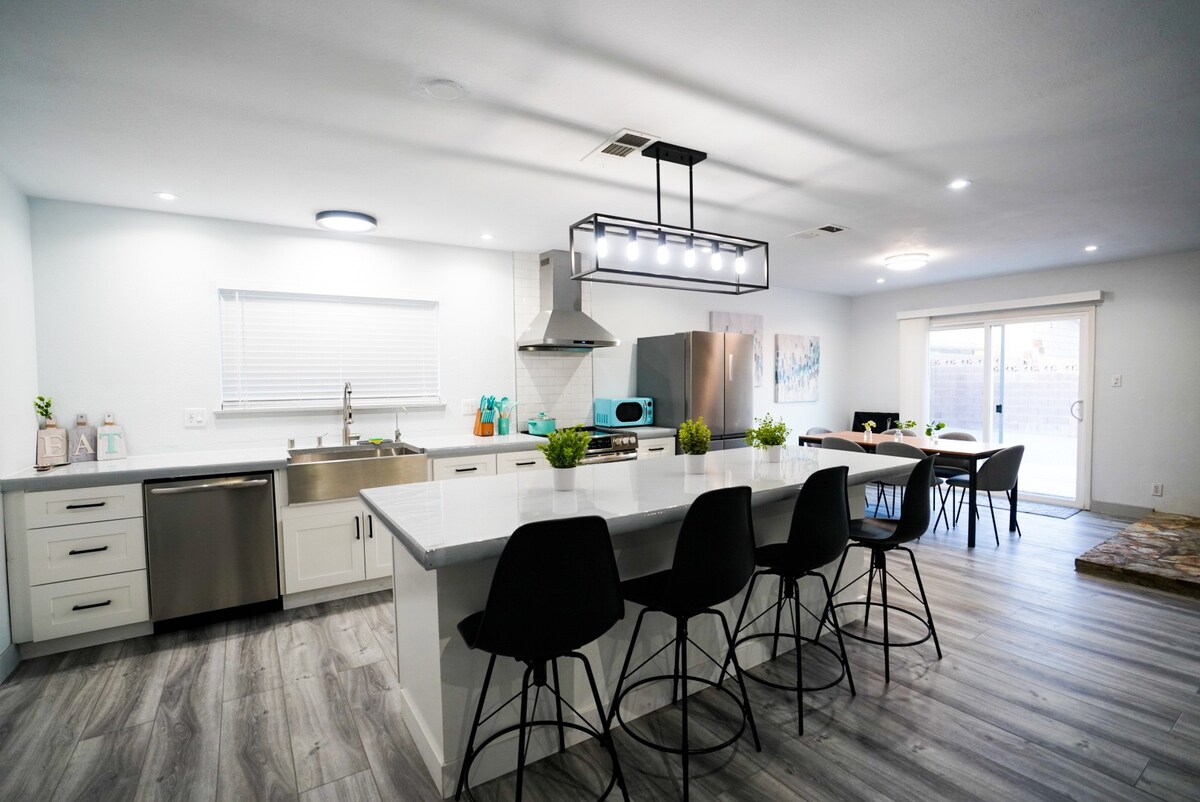 🌴 Long term visitors welcome! Private pool + spa (complimentary spa heating), cardio room, Samsung appliances, and modern upgrades throughout. Typically about 15–20 minutes to the Strip depending on traffic and destination. This 2400+ sq ft renovated home features one-of-a-kind furniture, an 8ft sparkling chandelier, marble-style flooring, and a 75-inch Samsung 4K TV! NOTE: This is NOT a party space. Please be respectful of the rules and the lovely neighbors.
