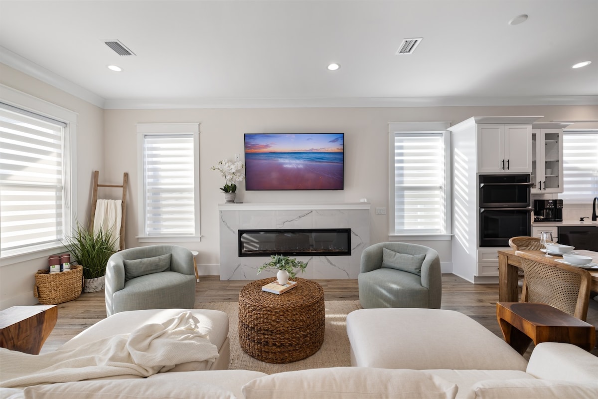 White sand beach just steps away & beach views. Spacious end-unit, on the beach side of Hwy 98 — walk to Mango Marley's and NEW "Bear Pizza". Coffee, ice cream, and several shops are only a 2-minute stroll away. 2 King suites (one with 2 twin beds) both with TVs Quality queen sleeper sofa 70" TV in the living area Washer & dryer High-speed WiFi 3 private decks with beach views/sunsets Grill Gas firepit Outdoor HOT shower Beach/fishing cart Beach chairs Bikes Extra parking