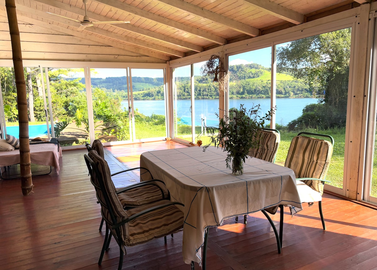 Дом с большой открытой площадкой и привилегированным видом на реку Уругвай. Внутреннее пространство уютное и укомплектовано всем необходимым: ванная комната, двуспальная кровать, диван-кровать, оборудованная кухня, пивоварня, камин, кондиционер, смарт-телевизор и Wi-Fi. Рядом с домом есть полноценный киоск с барбекю, столешницей с раковиной, дровяной плитой, газовой плитой, холодильником, микроволновой печью и ванной комнатой, идеально подходящий для отдыха и общения.