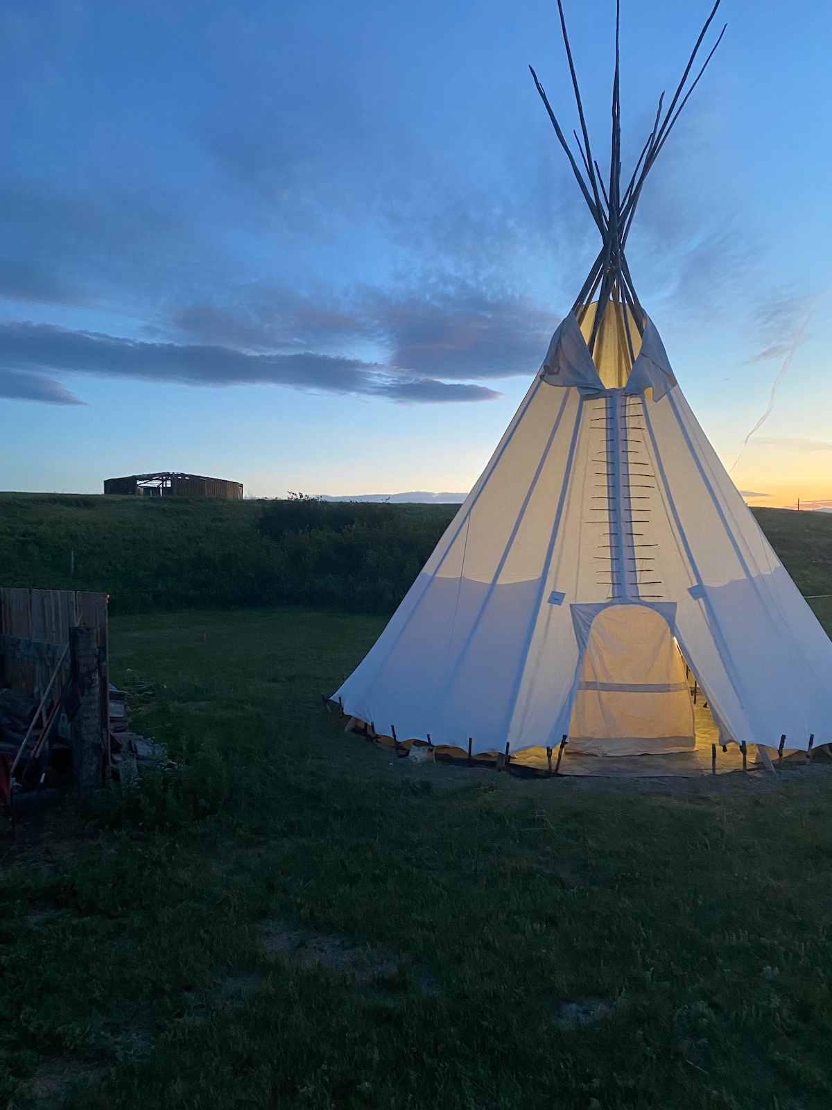 Experience Tipi Lodging Like no other! This 21ft, one of a kind stone floored Blackfoot style tipi can accommodate up to 4 Guests. This 15 Acre property is private, quiet and truly one with nature. we are located on the Piikani nation 20km west of Fort MacLeod, Alberta. Comes with the following: 4 Cebela cots Metal propane fire pit. Solar lights BRING YOUR OWN BEDDING. Pavilion Shelter (2100 sq ft) Rustic style Outhouse & Porta Potty Outdoor Hot-water Shower. Camp fire Shetler