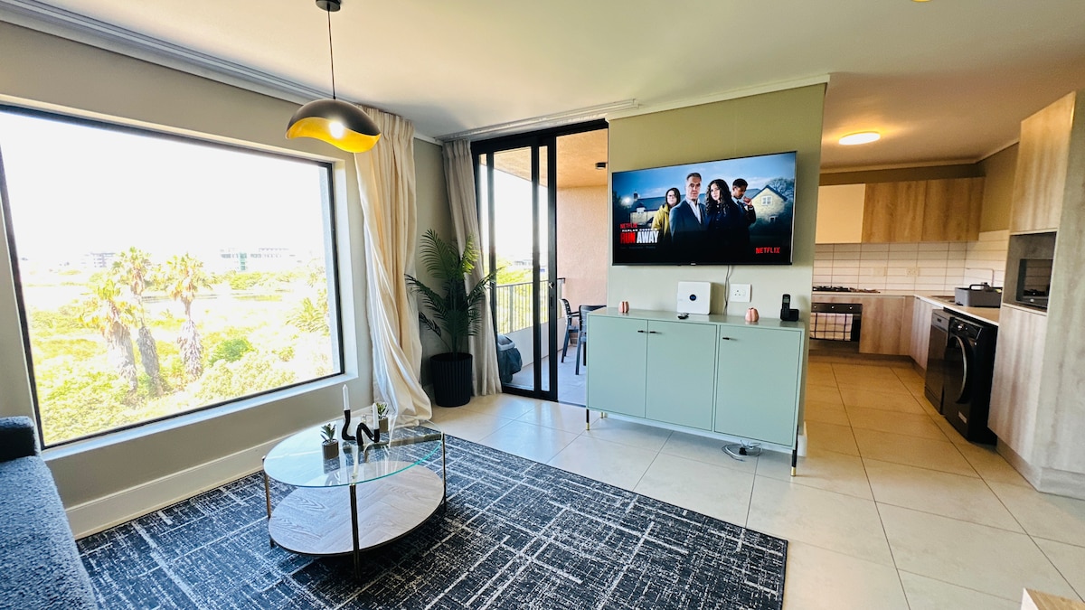 The studio apartment is a luxury, fully fitted, air-conditioned unit, perfectly placed along the beach in a secure 18 hole Links Golf Estate, with sweeping views of Table Mountain. This apartment is all about location - its on the 10th hole of a golf course, with a 2 minute direct access pathway to a popular kite/windsurfing beach. Perfect for remote work, walks or yoga on the beach, walking, running and cycling paths. Its within 1km of local restaurants, Seattle coffee and Woolworths Food