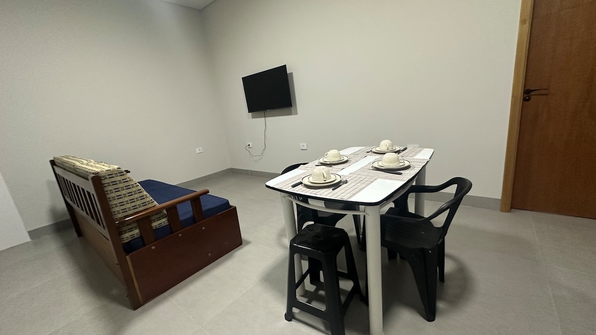 Leve toda família a este ótimo lugar com muito espaço e ar condicionado. Entrada independente ,estúdio de 30 metros quadrados no centro a poucos passos de supermercado e padaria e a poucas quadras das principais ruas e avenidas da cidade. Com banheiro, mesa com 4 bancos, copos, xícaras, pratos, talheres, caneca de alumínio e um fogão elétrico de uma boca. Fornecemos roupas de cama e banho, e sabonete liquido . Atente se que não possuímos berço .