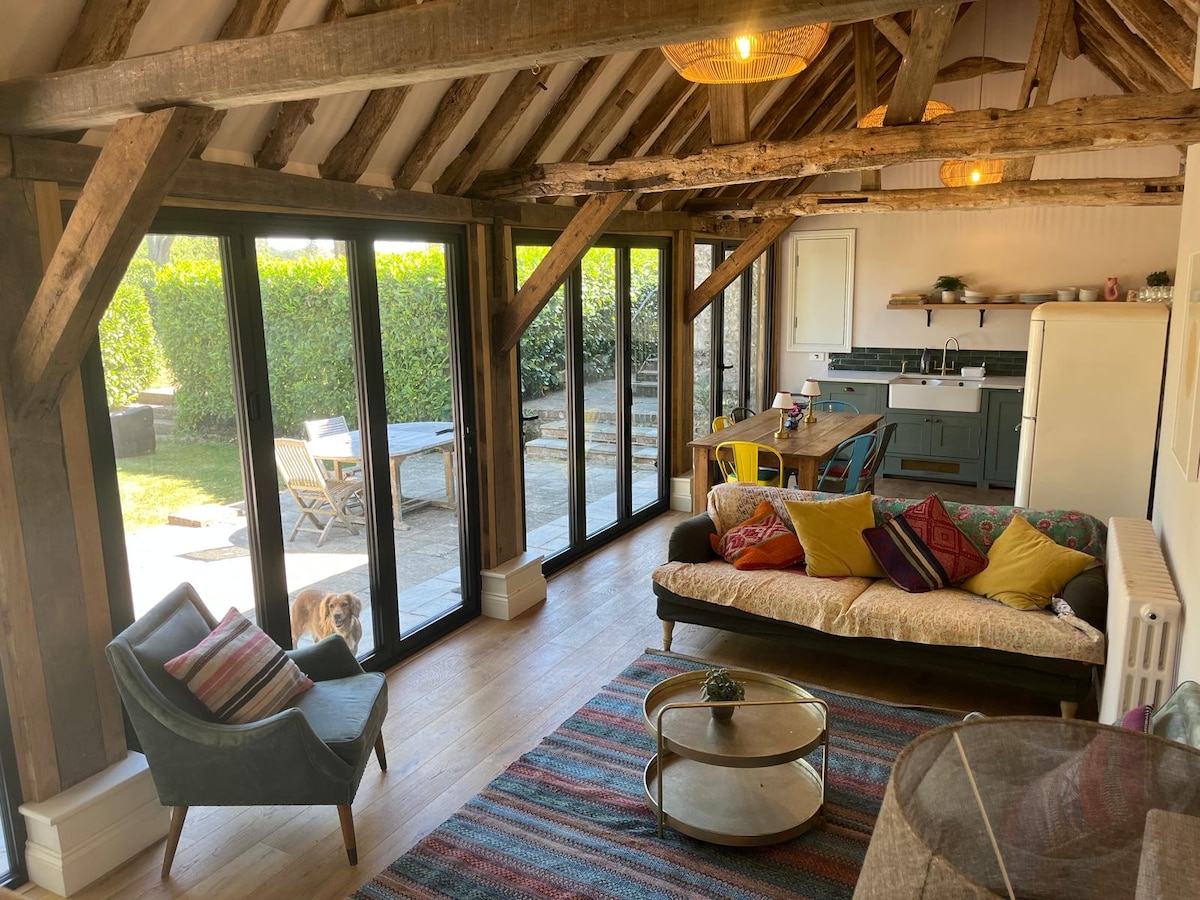 The barn is exclusive use with own self check in entry. It is an ideal location for the fresh air of the South Downs National Park, country walks, pubs and coastal visits. Alternatively, drive 20 minutes either way to Brighton or Eastbourne for the arts, nightlife or restaurant scenes. This accommodation provides a warm and comfortable welcome providing peace and quiet within a village environment. We are situated near the South Downs which is accessible by bike or car, only a 3 mile drive/ride in country lanes. The opera house Glyndebourne is a short distance, as is Charleston farmhouse, the country home of the Bloomsbury set. Ideally situated for the best of East Sussex. We have a private drive for you to park and separate access to the barn, to allow privacy. There is an area of garden and terrace available for you to enjoy the views. All the accommodation is on one level and assistance to terrace from the garden for wheelchairs will be made available if required. We live in the house north of the barn and will be mostly available to help with local knowledge of trips, attractions and restaurant recommendations. Our local inn The Yew Tree is most welcoming and offers our local ale "Harveys" as well as many of the local artisan brews such as Longman. The house is a three-minute walk from the village store offering homemade foods and local produce, as well as a cafe. The beaches at Seaford and Newhaven are a 15-minute drive away. There are wonderful village pubs all within striking distance. Berwick station is only 2.5 miles away with trains going to London, Gatwick, Brighton and Eastbourne. The airport LGW London Gatwick is a 45 minute drive away, LHR London Heathrow 1hr 15 minutes approx. The public transport is limited and we would recommend you use a taxi if you do not have a car. The barn has extensive views, including the bedroom which has a wonderful view across the gardens. The barn adjoins a large green field which is grown for meadow hay. The sunsets behind the ancient saxon burial mound known as Mount Caburn. The burning sky sunsets are the best!