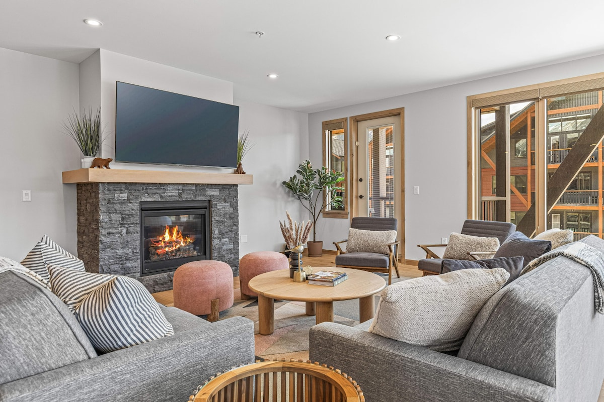 This updated suite has everything you need for a perfect vacation. Cook in the fully stocked kitchen, relax on the pull-out couch by the fireplace, and enjoy pool/mountain views from the patio. Features a king bedroom with patio access, full bath, and in-suite laundry. Amenities: heated outdoor pool, 2 hot tubs, fitness room, spa, EV chargers, underground parking with car wash, and BBQ courtyard. Pricing is set - No discounts