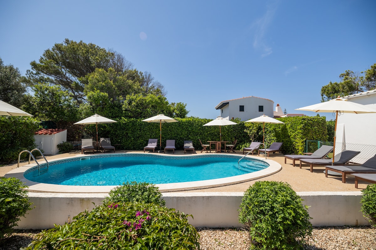 В очаровательном общественном саду, с видом на юг и одной из самых красивых бухт Менорки (Кало-Блан), рядом с Ками-де-Каваллс и в 250 метрах от пляжа Бинисафуллер. Удобное пространство, со вкусом отремонтированное и очень хорошо оборудованное (оптоволоконный интернет 500 Мб, кондиционер, кровать 160 см, ...), в котором можно насладиться террасой и огромным бассейном, который включает в себя детскую зону. Красивое место, идеально подходит для отдыха и в шаговой доступности от ресторанов национальной и международной кухни.