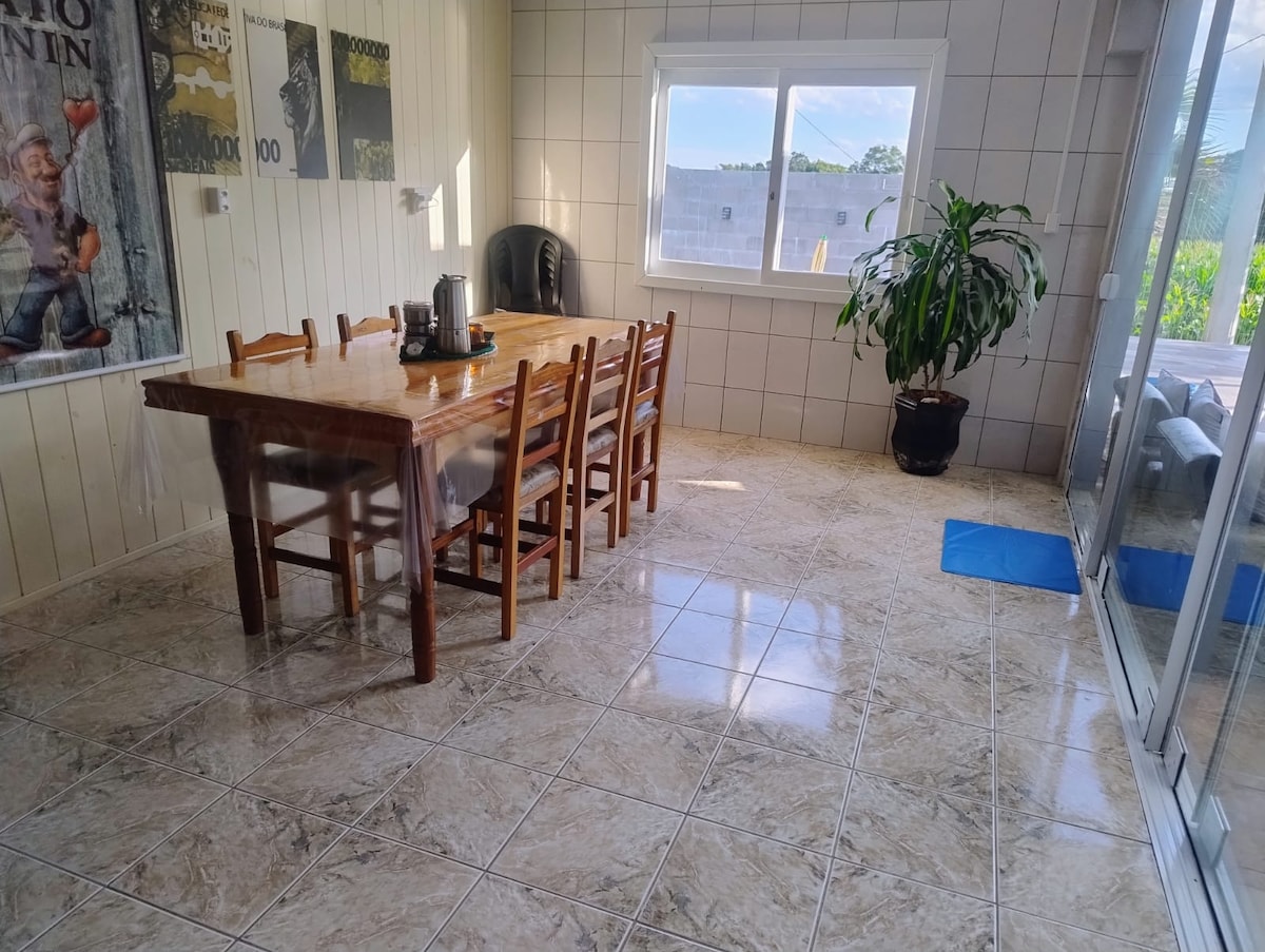 Деревенский дом на шоссе на 53 км и в 7 км от центра города Санандува. В ней 2 комнаты с кондиционером, двуспальная кровать. Большая комната с камином. Кухня с холодильником и пивоварней. В мезонине есть бильярдный стол. В доме 2 террасы: одна на первом этаже, а другая наверху, сзади, с видом на широкую лужайку, которая спускается к ручью. Здесь также есть освещенная площадка для пляжного волейбола, Alexa 4 и настенный бокс типа 2. Вас могут попросить предоставить CPF для предоставления отчета о сумме, полученной для федерального дохода