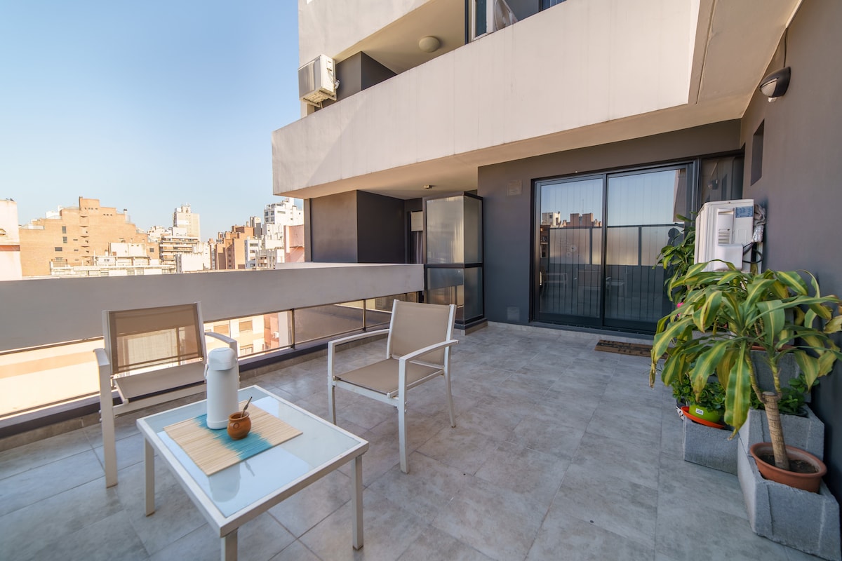 Depto de 1 dormitorio sin vecinos tiene terraza y cochera propia con sillones, mesa y asador. Cuenta con living/oficina/consultorio, cocina comedor equipada, baño completo y entrada independiente. Decorado con estilo y mucha luz natural. WiFi, TV Smart y todos los servicios. Ubicado en zona tranquila y segura, cerca de todo en pleno gral Paz.