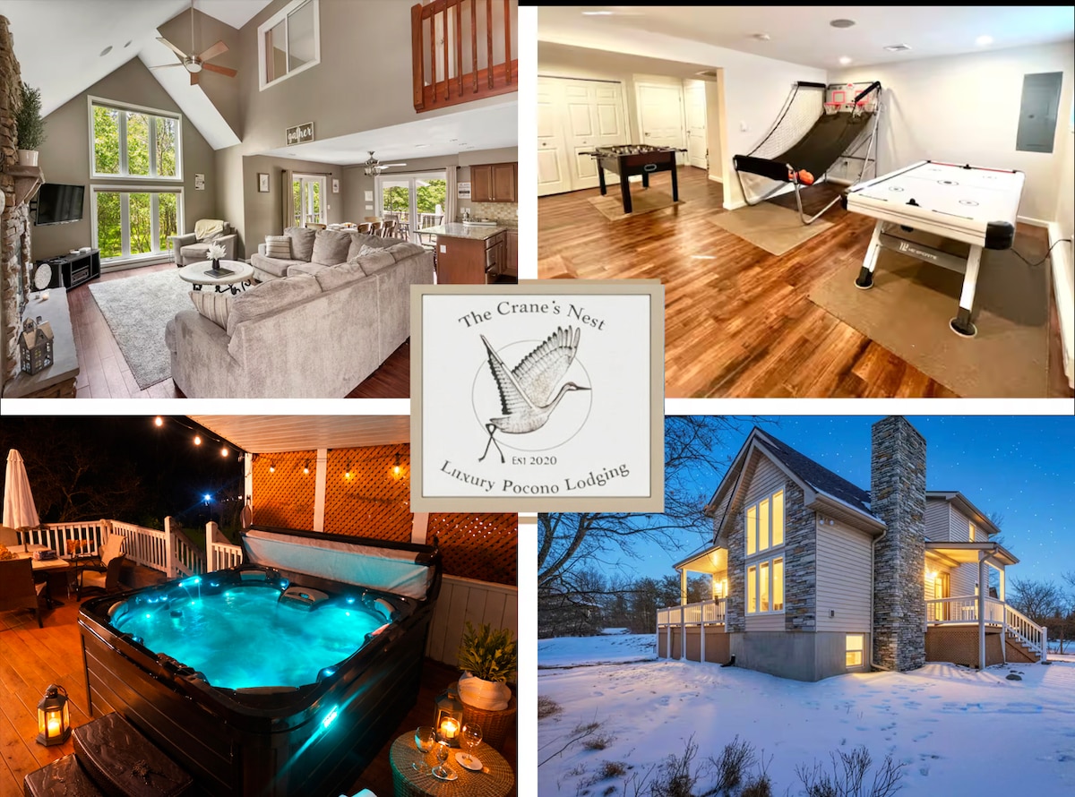 Спрятано в горах Поконо Недавно обновленное, современное, просторное и гостеприимное семейное шале в удобном районе. Частный дом площадью 3000 кв. футов с 4 спальнями и 3 ванными комнатами, расположенный на участке площадью 1,5 акра с панорамным видом на охраняемый лесной заповедник Насладитесь сауной, новой гидромассажной ванной, игровой комнатой, камином, костровой ямой. В распоряжении гостей 5 озер, 3 пляжа, озеро для рыбалки, 2 бассейна, игровые площадки, теннисные корты и баскетбольные площадки. Моменты от наблюдения за птицами, пеших прогулок, виноделен, катания на лыжах, аквапарков в помещении, гольфа и казино