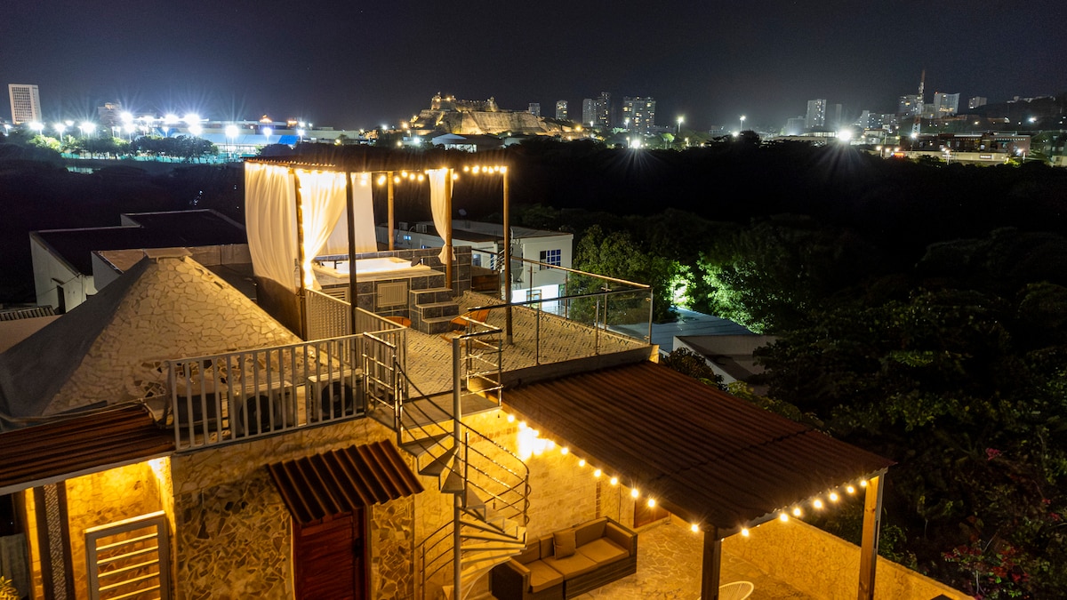 Полностью оборудованная квартира с 2 спальнями в огороженном стенами городе. Шикарное новое здание с бассейном на крыше и джакузи (без подогрева). мебель на заказ: кедровая и тиковая древесина Мраморные ванные комнаты+горячая вода быстрый Wi-Fi, 65-дюймовый телевизор, Netflix. Балкон площадью 18 кв. м, крытый/открытый тропический сад, 2 дивана + 6-местный обеденный стол. Главная спальня: отдельная ванная. Круглосуточная стойка регистрации В нескольких шагах от кафе, ресторанов и ночной жизни возле главного городского пирса Рядом с La Serrezuela, драгоценная бычья арена, превращенная в торговый и кулинарный центр