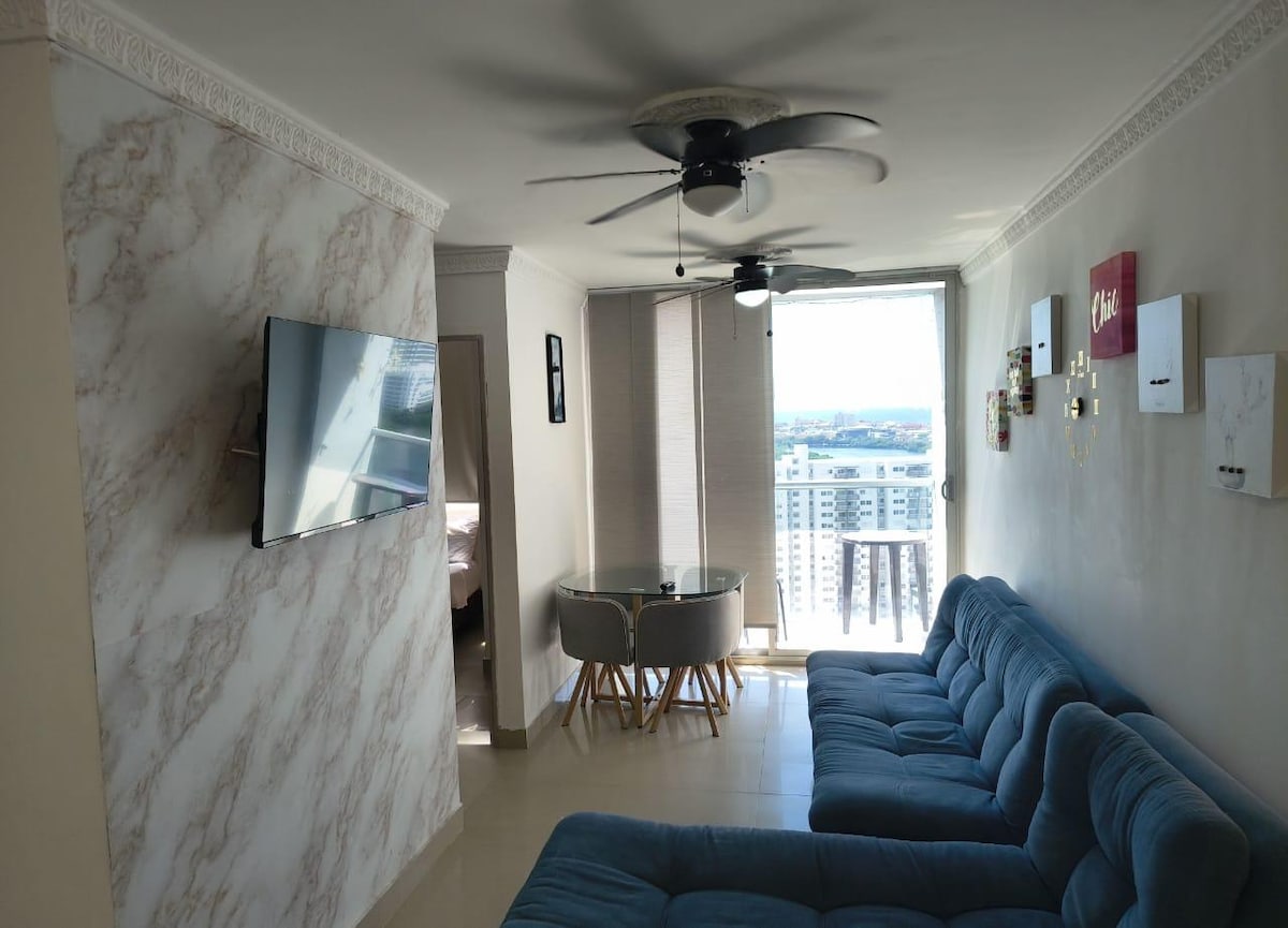 Это квартира на высоком этаже со всем видом на море, город-крепость, рядом с заливом Картахена, в очень элегантном здании, в самом безопасном районе Колумбии, где рядом будут лучшие рестораны, супермаркеты, аптека, пляж и залив Картахены. В квартире 1 комната с 2 (двумя) двуспальными кроватями, 2 ванные комнаты, гостиная с двумя очень большими диванами-кроватями, кухня и большой балкон с гостиной и столовой для наслаждения закатом.