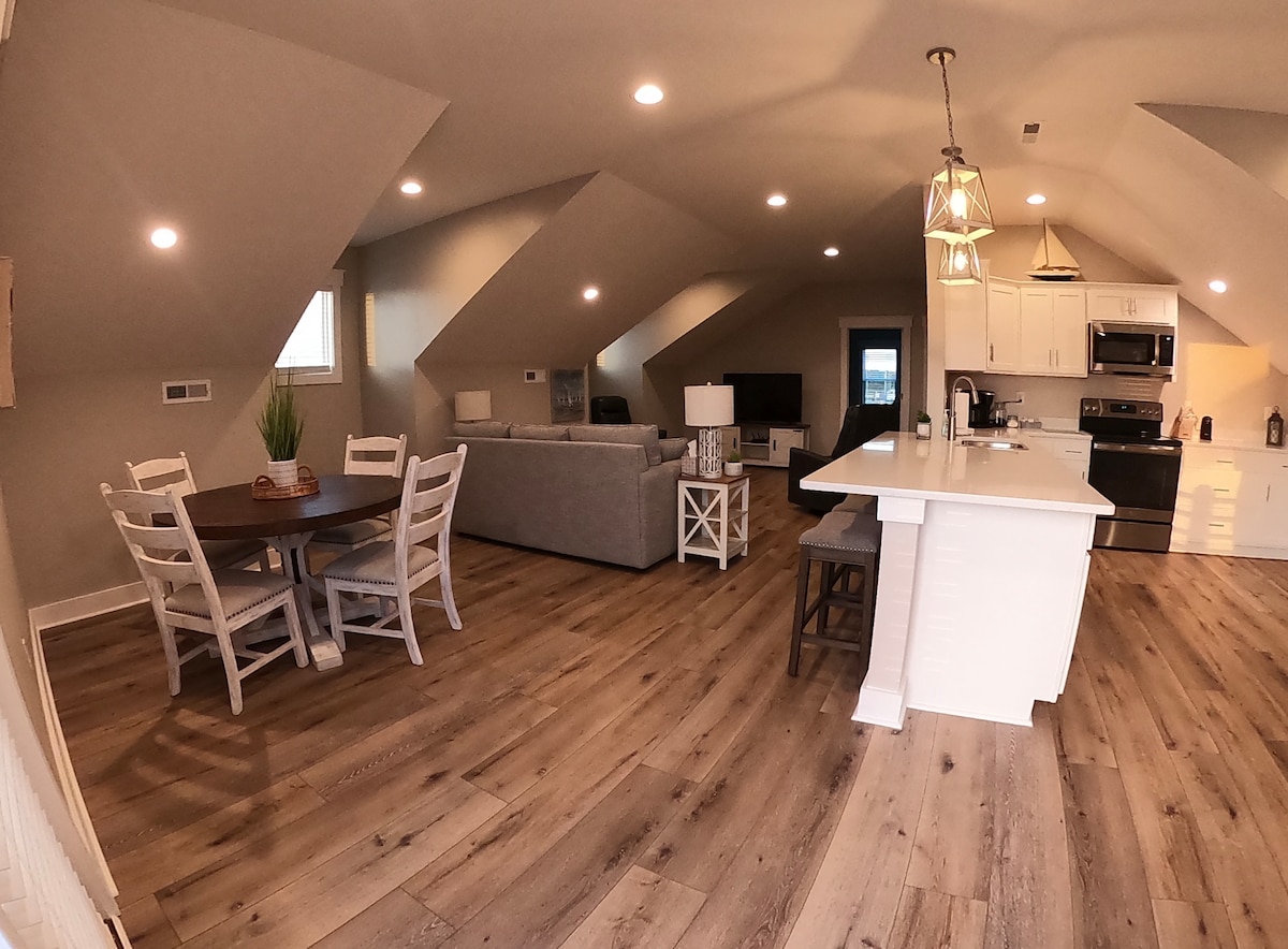 Это идеальное место, чтобы отдохнуть и расслабиться и насладиться сельской, речной жизнью. Каретный домик площадью 650 квадратных футов с открытой гостиной с полной ванной, кроватью размера Queen size, гостиной и кухней на втором этаже нашего каретного домика. Есть терраса с прекрасным видом на лодки и закаты. У вас есть доступ к нашей док-станции для купания на солнце, рыбалки и купания.