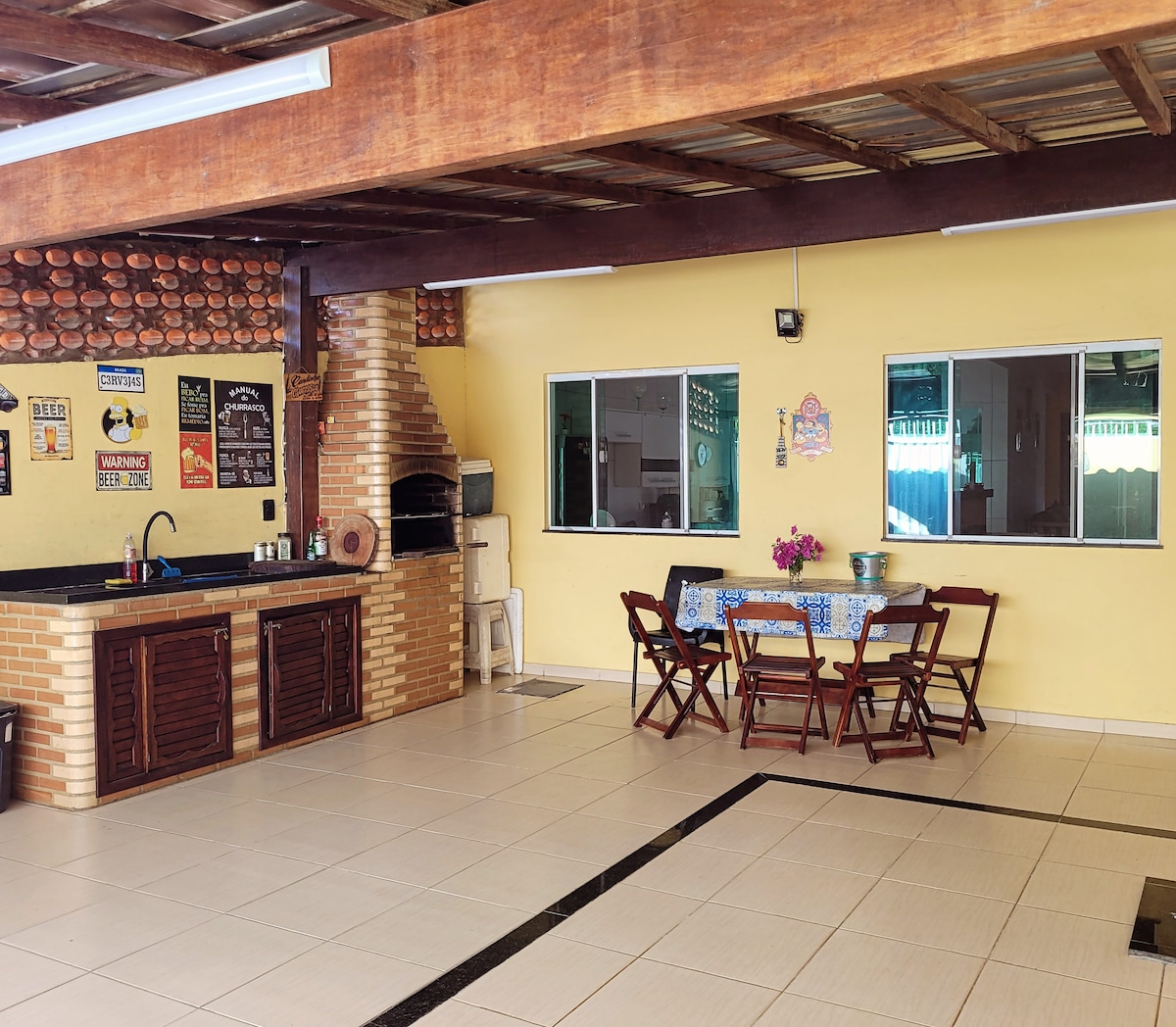 Дом в кондоминиуме, 90 метров от пляжа, главная улица. Дом с 2 спальнями, 1 спальня с двуспальной кроватью, 1 спальня с 4 односпальными кроватями, 5 матрасов, 1 двуспальный матрас, 2 внутренние ванные комнаты, кухня и гостиная, большая территория с барбекю и душем, 2 места для гамаков. Потолочный вентилятор в спальнях и гостиной 43-дюймовый телевизор (Smart TV). Wi-Fi. Звуковая коробка Bluetooth ° Микроволновая печья; Фритюрница Кастрюля Сандуичайра Блендер У нас есть столовые приборы, тарелки, стаканы и кастрюли.