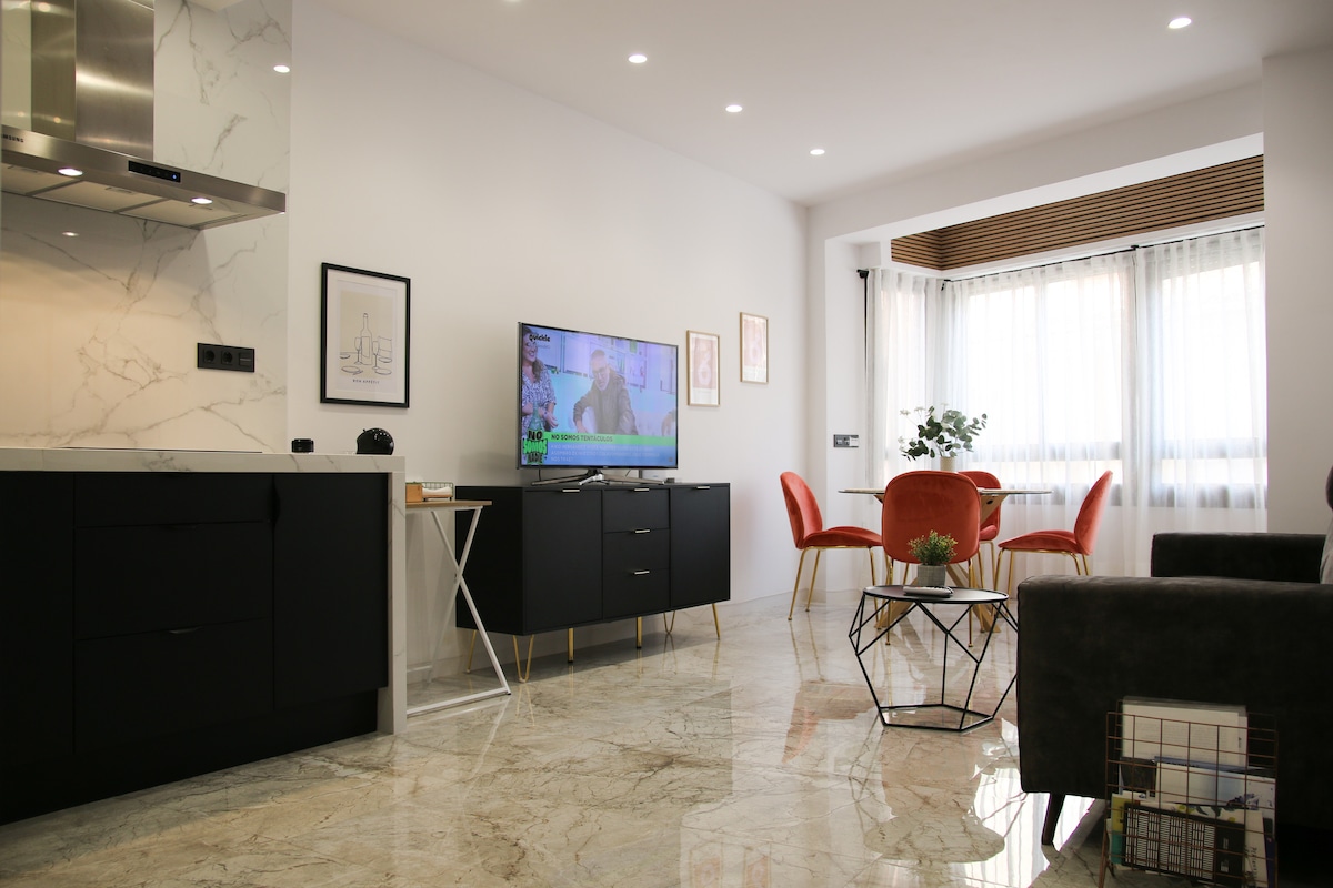 Очень светлые апартаменты с видом на Plaza Tetuan или Plaza Notario Mas, от 52 до 56м2. Спальня с двуспальной кроватью 180 . Апартаменты спроектированы и оборудованы, технически оборудованы для обеспечения их благополучия, с кондиционером во всех номерах, моторизованными жалюзи, 43-дюймовым Smart TV, Wi-Fi, утюгом и сейфом. На кухне есть керамическая плита, микроволновая печь, холодильник, кофеварка Nespresso, стиральная машина, кухонная посуда и чистящие средства.