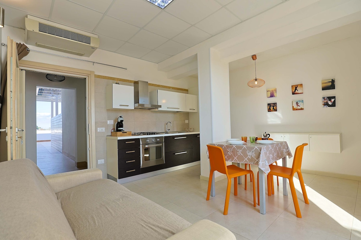 Bilocale di 40 mq situato al piano terra con accesso indipendente da terrazzino privato di circa 10 mq arredato. Dotato di camera da letto matrimoniale, bagno privato con doccia, living con angolo cottura e divano letto matrimoniale. L'appartamento è dotato di tutti i comfort: aria condizionata, tende oscuranti, smart tv, wi-fi, asciugacapelli. Questo appartamento ha un accesso facilitato, sanitari idonei a persone anziane o con difficoltà motorie, doccia con maniglione e seggiolino disabili.