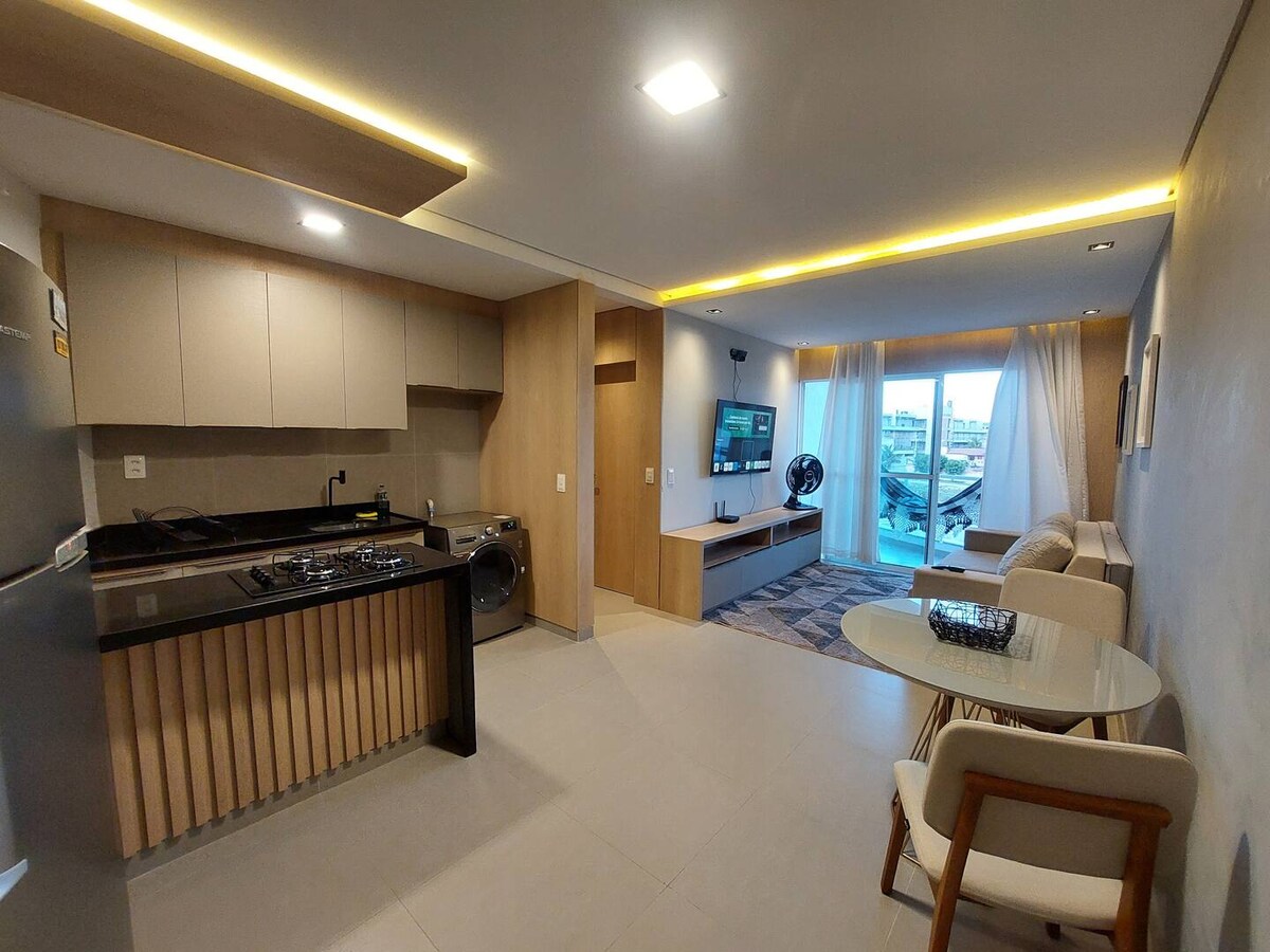 Насладитесь комфортом и элегантностью в этой квартире, расположенной в Вила-ду-Кумбуко. Мы находимся в 4 минутах ходьбы от пляжа, в 3 минутах от центра деревни и в 1 минуте от лучших баров и ресторанов. В нашем жилье могут разместиться до 4 человек. В нем 2 спальни (1 люкс), обе с двуспальной кроватью и кондиционером, 1 гостиная, структура для домашнего офиса и высокоскоростной Wi-Fi; 1 оборудованная кухня; 2 ванные комнаты с электрическим душем и парковка перед домом.