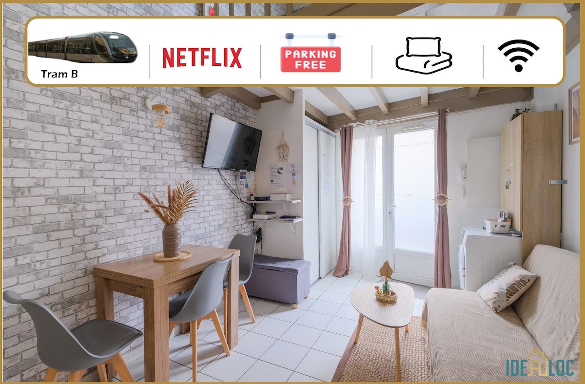Рядом с моим жильем находится золотой треугольник (700 м от площади Гамбетта), торговый центр Mériadeck, трамвайные линии F (станция аэропорта) и A, велосипедные станции. Наш дом расположен в тихом районе. Он приятный, хорошо оборудованный, современный, с хорошим интернетом и комфортный: вам понравится! Жилье подходит для деловых путешественников, пар с 1 ребенком или 3 взрослых без детей. Оно классифицируется как четырехзвездочное оборудованное туристическое жилье.
