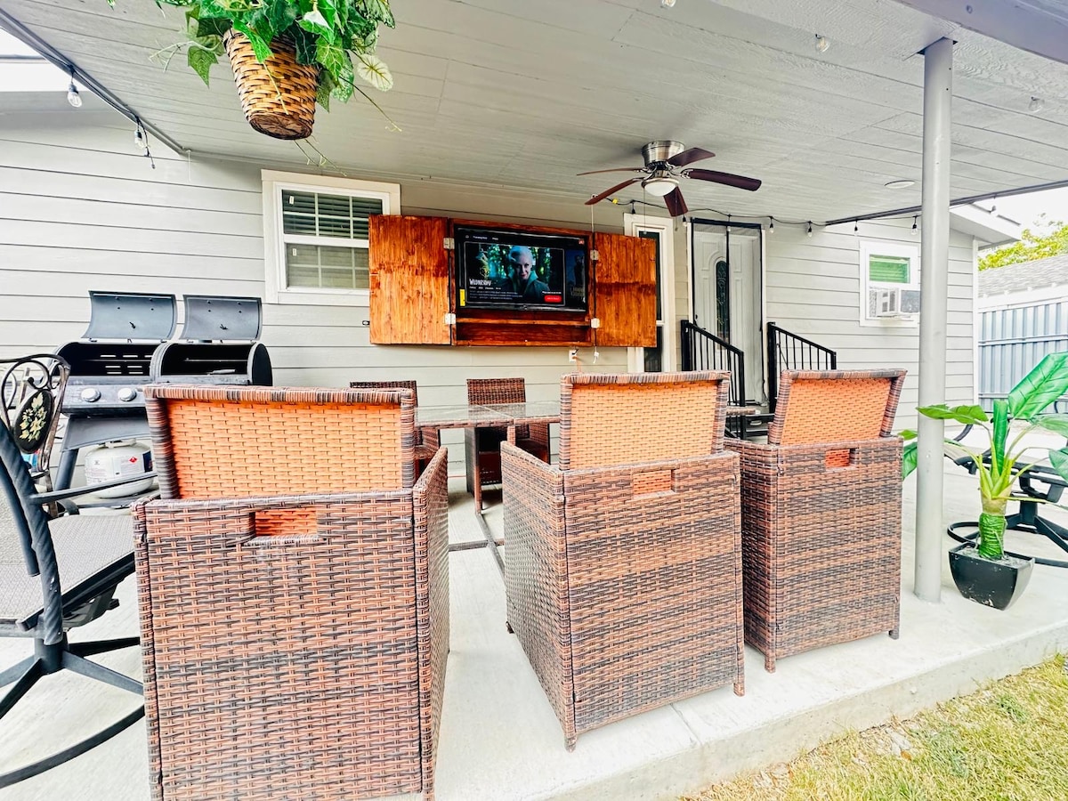 *Отдохните в спокойном месте в 10 минутах от центра Далласа в Норт-Оук-Клифф. Бунгало 1940-х годов, расположенное в тропическом ландшафте, является местом отдыха на открытом воздухе с собственной гидромассажной ванной и бассейном, большой террасой и комнатой с тики. *Удобное расположение в 5 минутах от района искусств Бишоп. *Гостиная и столовая: камин, 43-дюймовый телевизор, большие окна, столовая на 6 человек. *Главная спальня с кроватью размера King size, 1/2 ванной, 43-дюймовым телевизором и дверью в комнату с тики. *Вторая спальня: двуспальная кровать размера Queen size, 40-дюймовый телевизор и рабочий стол. *Кухня: плита Wolf, микроволновая печь, стол для готовки, большой холодильник.