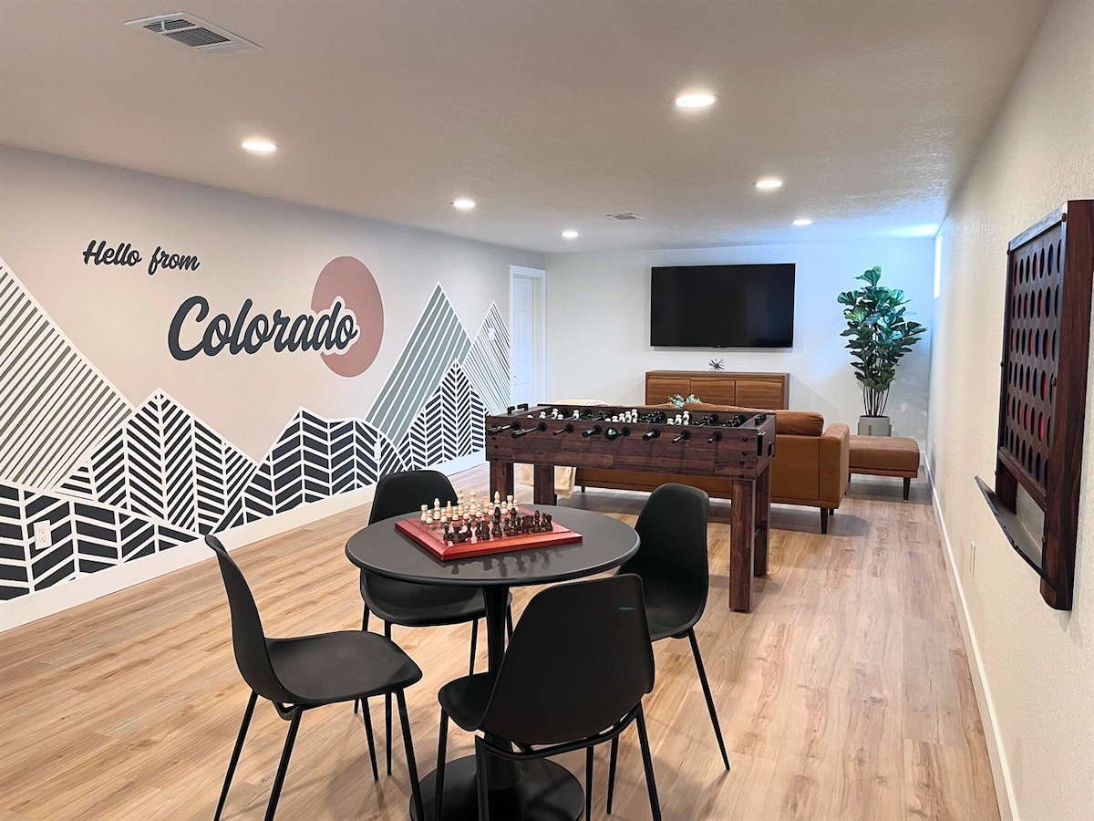 5BR, with Peloton, work & workout space, 60 game tabletop arcade, beautiful covered patio w/firepit located in Denver's Tech Center walkable to restaurants, bars, Starbucks, a grocery store and Fiddlers Green for outdoor concerts. There are nearby bike paths, a public library and play grounds. Just added a Pickleball set for the new Pickleball court 1 block away. Don't forget the Light Rail Station 1 mile away to get downtown or to/from the airport! We offer FREE Early Check-In when available