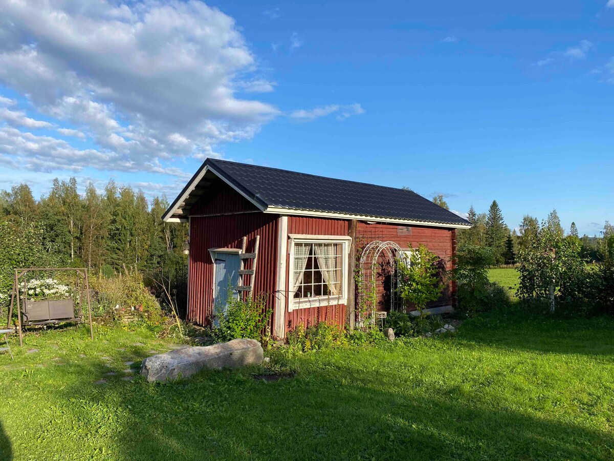 Оставайтесь дешевыми, но уютными во время поездки. Коттедж расположен недалеко от маршрута 4, и вы можете подъехать ко двору, рядом с хижиной. Двор упоминается уникально, и изначально коттедж был древней дымовой сауной, спроектированной и реализованной графическим дизайнером Лаурой Матикайнен из Бельгии. Туалет - это старый душ на улице. Мы предоставием средства для мытья рук и воду. В коттедже есть холодильник, плита, кофе и чайники, кастрюля и одноразовая посуда.
