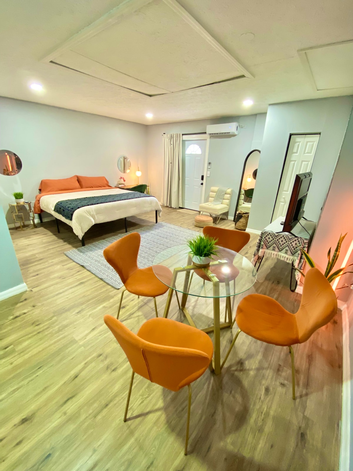 Это безупречно продуманное жилье с открытой планировкой в стиле лофт с открытой планировкой идеально подходит для пар или небольших групп. Окна от пола до потолка позволяют естественному свету наполнять пространство, обеспечивая при этом полное уединение во время вашего пребывания. До высококлассных ресторанов Зимнего парка и оживленной арт-сцены Торнтон-Парк можно всего за несколько минут. До Universal всего 20 минут, Disney - 35 минут, MCO - в 20 минутах.