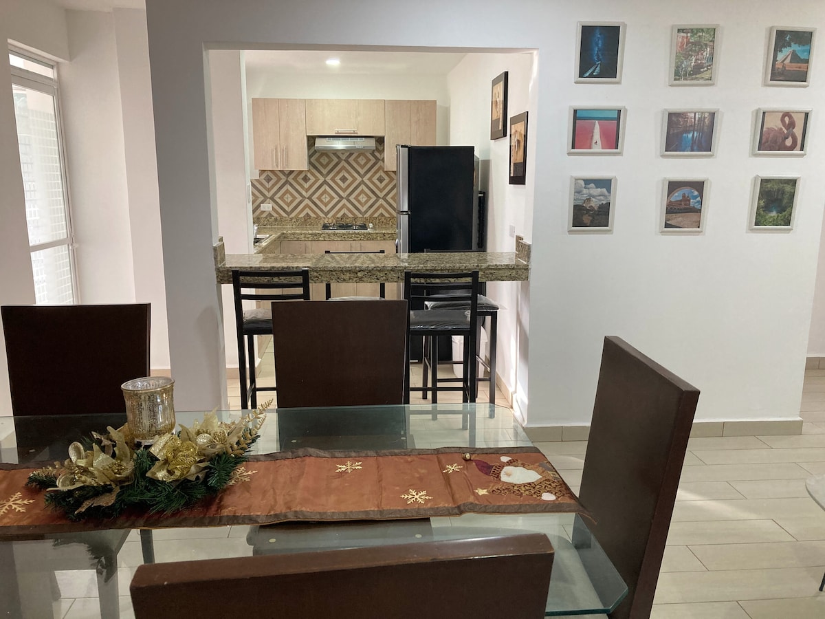 Ubicado en un primer piso, el Depto Cuenta con 2 sofás en la sala, un comedor con cuatro sillas de madera, la cocina cuenta con refrigerador, estufa de inducción, platos, vasos, tazas, cubiertos, jabón para platos, horno de microondas, utensilios de cocina, sartén, etc; en la habitación cuenta con una cama matrimonial con su juego de sábanas, un buró con lámpara de lectura, televisión con Netflix, aire acondicionado y en la segunda recámara una cama con sus sábanas, Buró y aire acondicionado