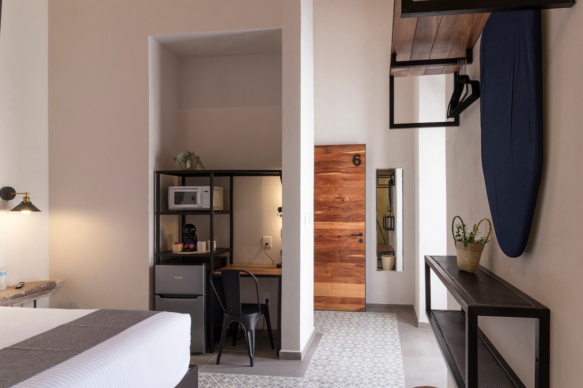 Casa Dos Cuervos в центре Керетаро. Наслаждайтесь уникальным жильем в нашем люксе, спроектированном студией дизайна интерьера. К услугам гостей двуспальная кровать размера King size, кондиционер, оборудованная мини-кухня и отдельная ванная комната. На верхнем этаже вы найдете просторный люкс с двуспальной кроватью размера King size, кондиционером, кондиционером, телевизором и зоной домашнего офиса. Всегда чисто и готово к вашему приезду. Познакомьтесь с городом Керетаро как местный житель в эксклюзивном и комфортном жилье.