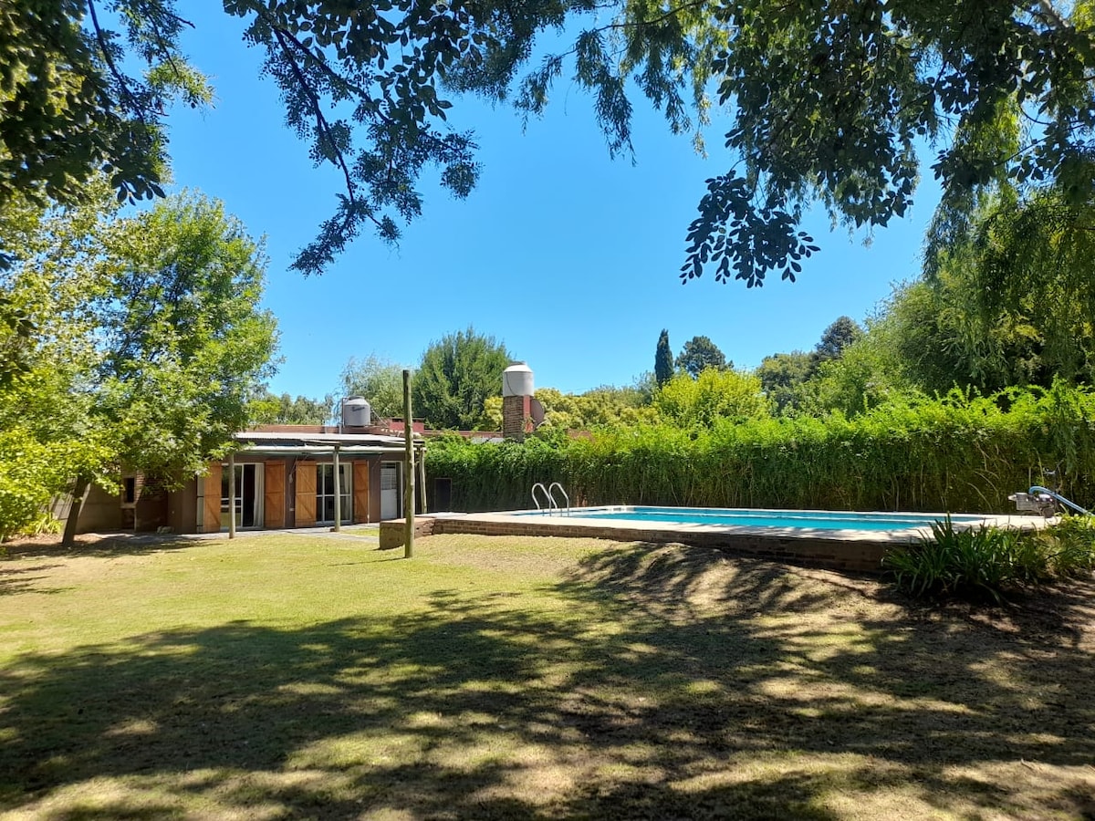 Relajate en este alojamiento único y tranquilo, alejado del ruido y rodeado de una sombra que invita a descansar. Sencillo pero acogedor. Para pasar un fin de semana en la naturaleza, disfrutando de la pileta (en verano) o de un rico asado y una tarde al aire libre. Ubicado a 4 km del centro de la ciudad, muy cerca de restaurantes estilo campo como "El bodegón de Campo", "El Stud", "Doña Tita", A tan sólo 1 cuadra y media de la ruta 7 (entrada a la ciudad).