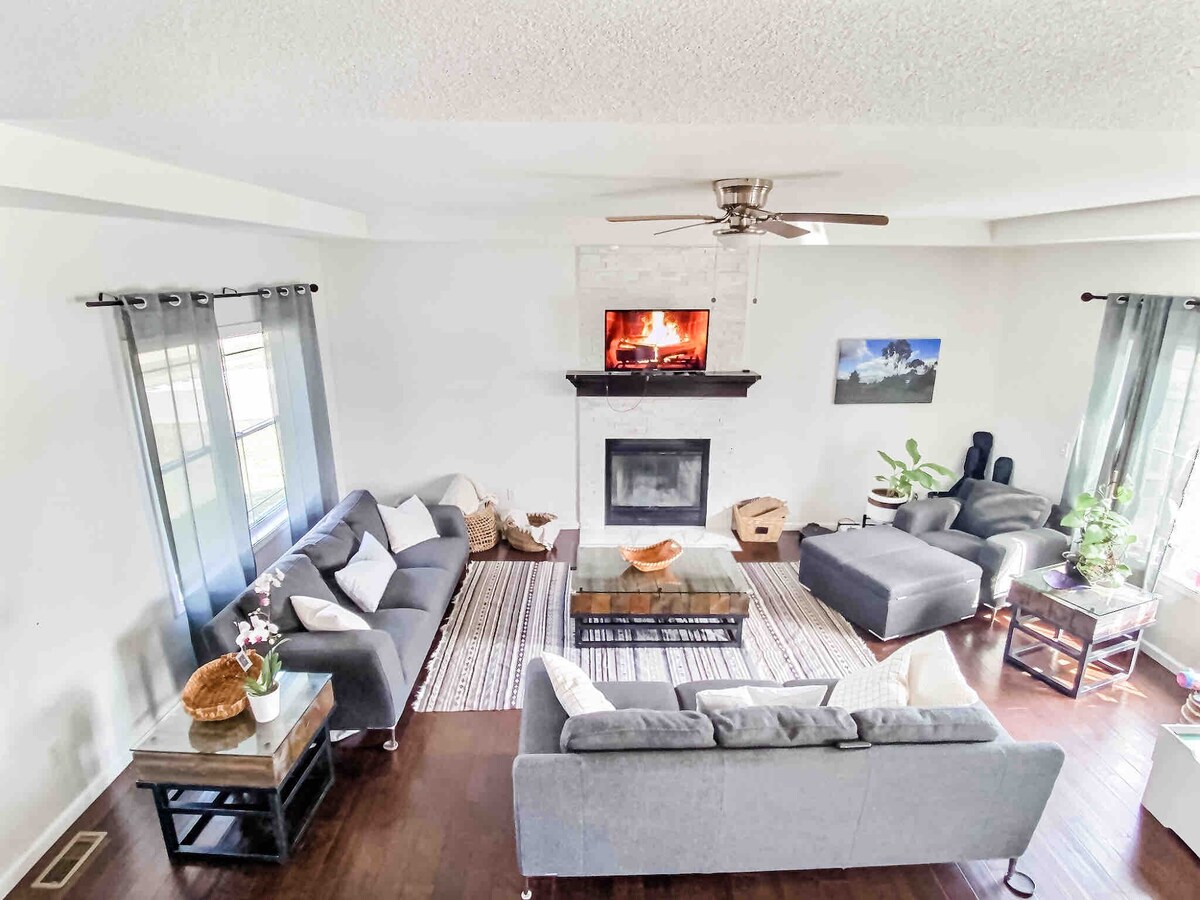 Просторный двухуровневый дом с открытой планировкой, идеально подходящий для небольших встреч и семей. В столовой есть большая терраса с грилем, большой огороженный задний двор и костровая чаша для вашего удовольствия. В цокольном этаже есть большой секционный и 60-дюймовый телевизор с Amazon Video. Рядом есть продуктовые магазины, рестораны и многое другое. Прачечная также доступна. *Пожалуйста, спросите, заинтересованы ли вы в длительном проживании, у нас могут быть свободные даты, которые не отображаются в календаре.