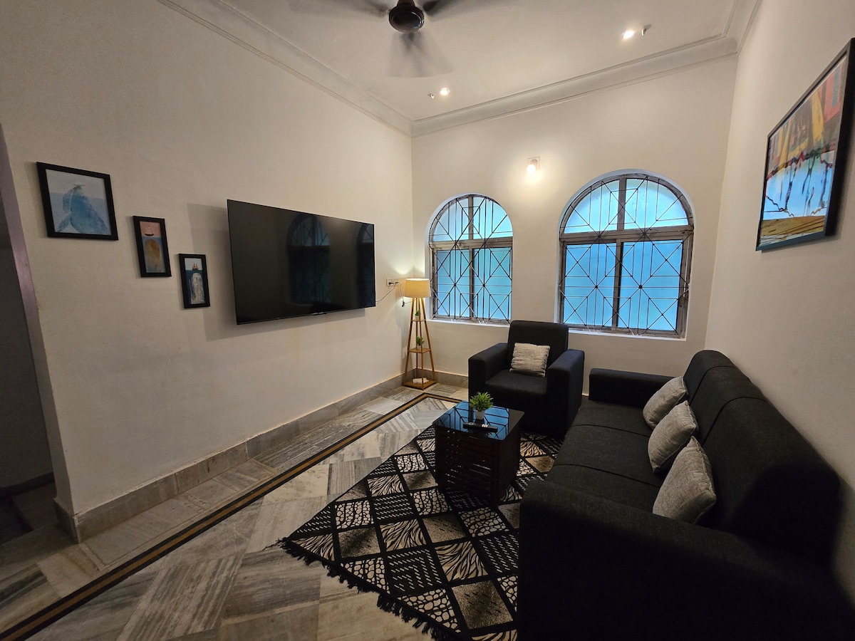 Добро пожаловать в Amber & Jade Stays, ваш уютный дом вдали от дома на тихой окраине Бхубанешвара. В этом стильном доме с 1 спальней и кухней сочетаются комфорт и природа. Здесь есть светлая гостиная, полностью оборудованная кухня и спальня с мягкой кроватью размера Queen size. Насладитесь современными удобствами, такими как Wi-Fi, кондиционер и телевизор Smart TV, в спокойной обстановке в окружении зелени. Идеально подходит для пар, путешественников или удаленных работников, ищущих спокойствие и удобство. Привезите своего пушистого друга и расслабьтесь в комфорте в Amber & Jade Stays. 🐾