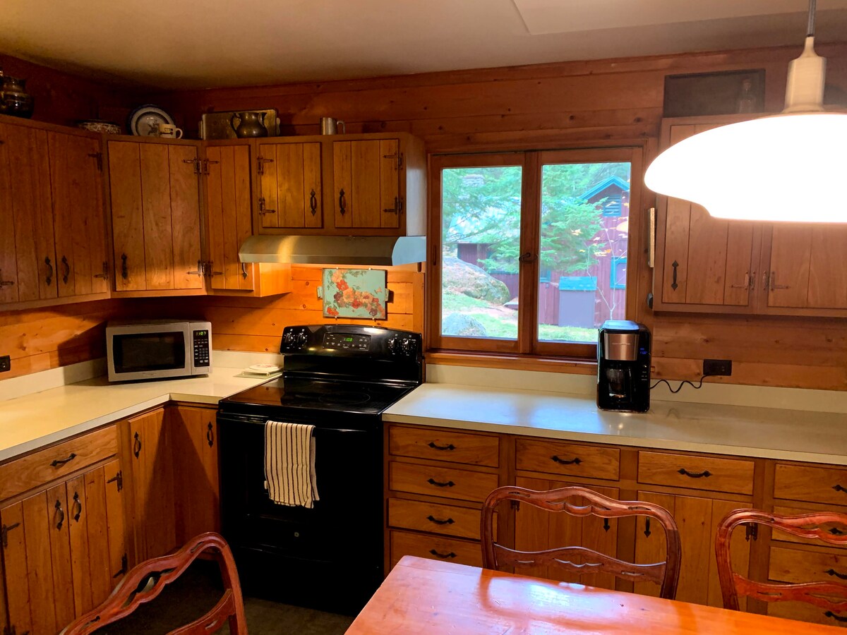Остановитесь в тихом современном домике, расположенном в центре города на проселочной дороге в Кине, доме Хай-Пикс в Адирондаке. Всего в 15–20 минутах езды от всех основных достопримечательностей: Лейк-Плэсид, Уайтфейс, Adirondack Loj и плотина Марси. Светлый и спокойный оазис, чтобы отдохнуть от приключений в Адирондак с видом на горы из вашей кровати, с террасы или из костровой ямы. Насладитесь частным лугом с выходом к естественному ручью с купальными лугами и водопадами. Кровать размера Queen size + раскладной диван, на котором могут разместиться 1 взрослый/2 детей. РАССЛАБЬТЕСЬ!