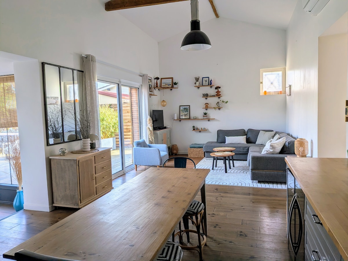 15 минут от центра Бордо, в тихой и зеленой обстановке, дом (флигель) площадью 42 м^2 в теплом и современном стиле. В доме есть спальня с двуспальной кроватью, душевая комната и гостиная/столовая с дополнительной кроватью (диван-кровать). Гости воспользуются бассейном в солнечные дни. В целях уважения тишины и тишины района запрещены вечеринки. Максимальная вместимость - 4 человека.
