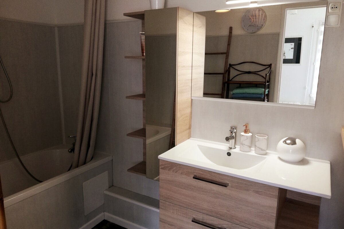Очаровательный маленький таунхаус с верандой с видом на небольшой огороженный сад. Оборудованная кухня с выходом в гостиную и гостиную, ванная комната с туалетом, душем и ванной. Наверху спальня с кроватью 140 и еще одна маленькая спальня с клак-клаком (спальные места 130 - bultex). гардеробная, прачечная со стиральной машиной и сушилкой Предоставляется постельное белье и полотенца. Магазины и автобусы в 5 минутах ходьбы. До Naval Group можно дойти пешком за 15 минут. Orano La Hague в 20 минут - EPR Flamanville в 30 минут на автомобиле.