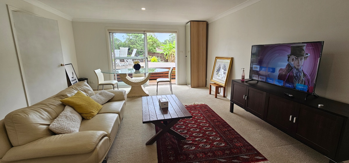 Гости говорят, что это так удобно! На Северном берегу. 35 минут на поезде до Сиднея, 2 минуты пешком до железнодорожного вокзала, деревни Вахрунга, отличных ресторанов, кафе и прекрасного парка Вахрунга. Тихая, автономная квартира с двумя спальнями, отдельным входом, спокойная обстановка в прекрасном тихом частном саду. Доступ к бассейну и прачечной. Парковка не на улице. Канальный кондиционер. Легко добраться до M1, крупных больниц, местных частных школ, Westfield, Macquarie Park. Пляжи в 30 минутах езды.