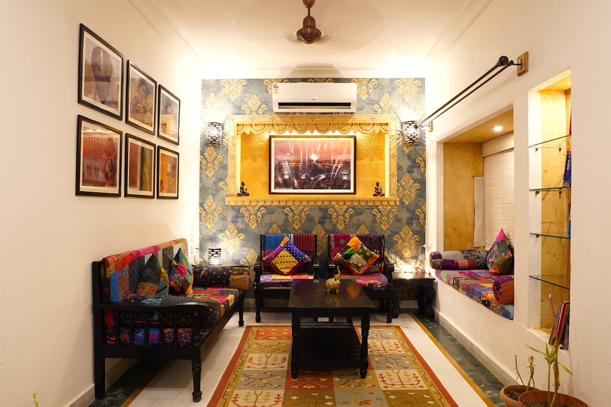 Домашняя еда также доступна по запросу 🍛 — так что вы можете насладиться настоящими местными блюдами во время вашего пребывания! 🌅 Добро пожаловать в наш прекрасный традиционный дом с 2 спальнями и кухней в центре Джайсалмера — всего в 10 минутах ходьбы от Патва Хавели 🕌 и в 1 км от знаменитого озера Гадисар 🌅. Зайдите в пространство, которое сочетает в себе традиции Раджастхана с современным комфортом. Насладитесь просторной гостиной с 80-дюймовым телевизором Smart TV 📺, где можно расслабиться и посмотреть любимые шоу на Netflix 🍿 после долгого дня знакомства с достопримечательностями.