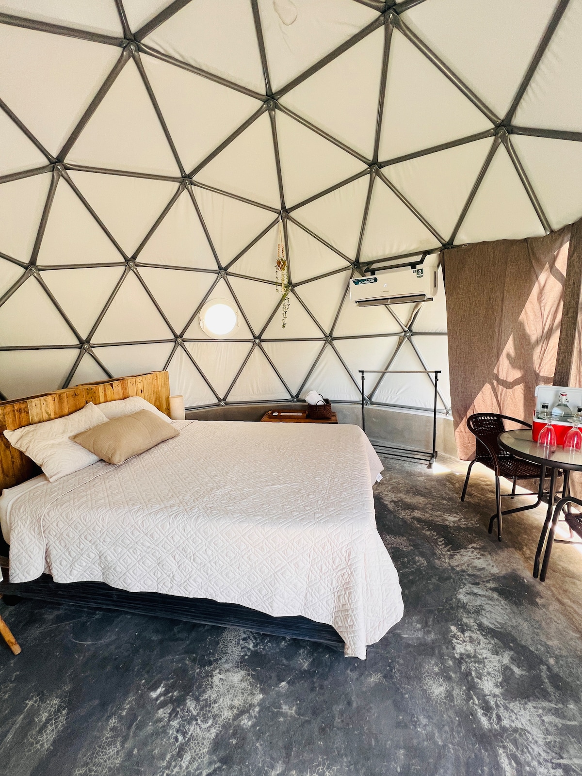 Крытый кемпинг в лесистой местности с прекрасным видом, частным палапой, деревянным полом, электрической установкой, освещением и общими экологическими ванными комнатами для большего комфорта. В цену входит глэмпинг для 2 человек, оборудованный супружеским матрасом, вентилятором, простынями, подушками, полотенцами и мылом за 500 долларов за каждое помещение. Оплата также включает доступ ко всем удобствам жилья, таким как ресторан, туалеты, душевые, волейбольная сетка, гамаки, пляжные стулья и пирс.
