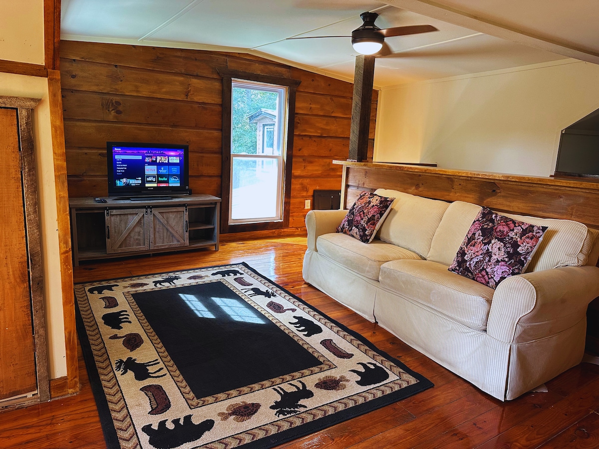 Наслаждайтесь своим домом вдали от дома. В вашем уютном люксе есть просторная СПАЛЬНЯ С КРОВАТЬЮ РАЗМЕРА KING SIZE и уютная гостиная с камином. Роскошная спа-салон с глубокой ванной комнатой подарит вам стресс. Доступ к частной клавиатуре и входу обеспечат вам возможность приходить и выходить, когда вам угодно. Мы предоставляем небольшой холодильник, микроволновую печь и кофейную станцию с закусками для вашего удобства. Наслаждайтесь качелями на крыльце прямо за пределами вашей комнаты за утренним кофе. Наслаждайтесь нашим новым костровищем по запросу.