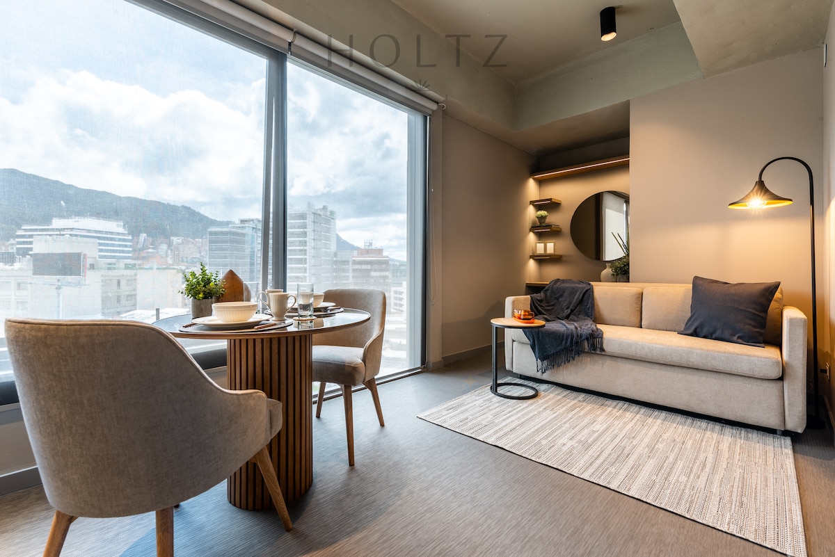 Loft by Holtz, fully furnished. Queen size bed with luxury lingerie, 400 thread 100% cotton + living room, plus desk. Wonderful view of the hills.Building with top common areas; Swimming pool, Gym, Yoga, Turkish bath, Pilates area and Trx. It has the *Spa service. Pool table, Restaurant, Co-working, access to the *Terraces for bbq, *Social Lounge with kitchen, (* have a reservation fee).
