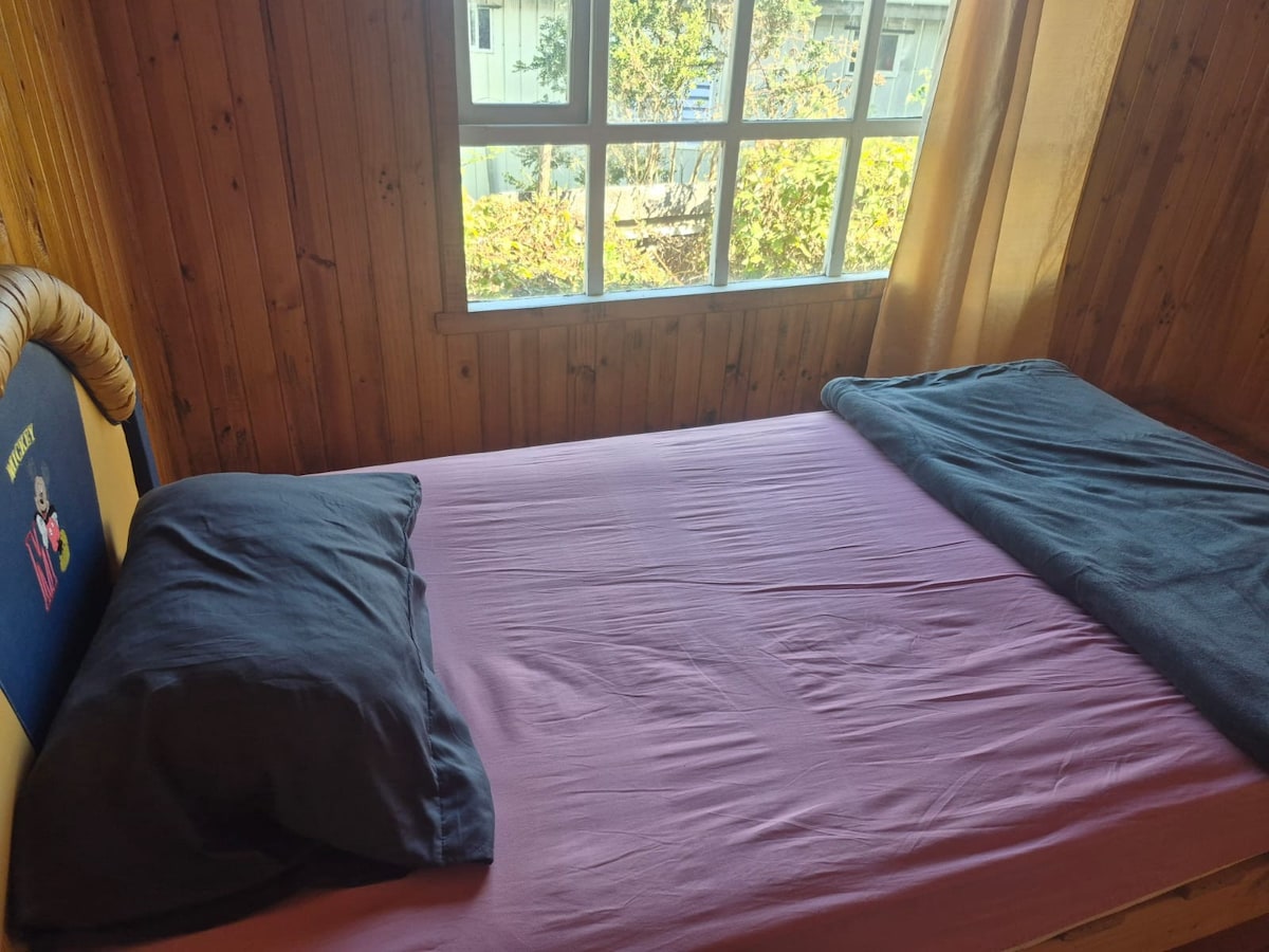 Casa equipada 5 personas... ubicada a 3 minutos del centro en vehículo, locomoción colectiva afuera de la casa. Es dpto interior con entrada independiente, estacionamiento, calefacción a pellet, wifi, roku, etc. En la casa principal (adelante) viven mis padres, quienes hacen entrega de las llaves de la cabaña y se encargan de todo lo que requiera el huésped. Se entrega una bolsa de Pellet cada 3 días de estadía. No cuenta con toallas ducha. Solo por temas de espacio, no se aceptan mascotas.